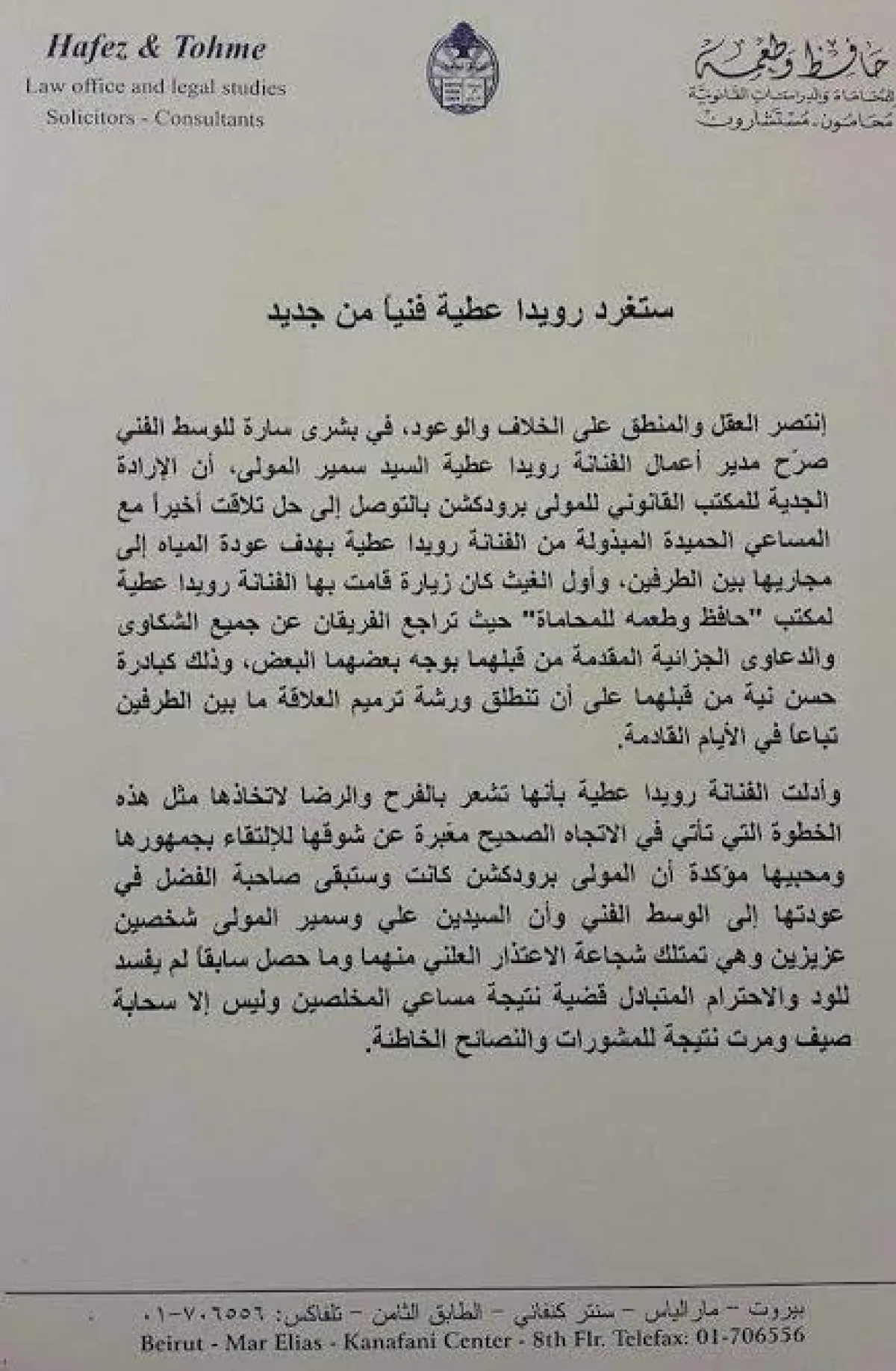"إنتصر العقل والمنطق على الخلاف والوعود، في بشرى سارة للوسط الفني صرّح مدير أعمال الفنانة رويدا عطية السيد سمير المولى، أن الإرادة الجدية للمكتب القانوني للمولى برودكشن بالتوصل إلى حل تلاقت أخيراً مع المساعي الحميدة المبذولة من الفنانة رويدا عطية بهدف عودة المياه إلى مجاريها بين الطرفين، وأول الغيث كان زيارة قامت بها الفنانة رويدا عطية لمكتب "حافظ وطعمه للمحاماة" حيث تراجع الفريقان عن جميع الشكاوى والدعاوى الجزائية المقدمة من قبلهما بوجه بعضهما البعض، وذلك كبادرة حسن نية من قبلهما على أن تنطلق ورشة ترميم العلاقة ما بين الطرفين تباعاً في الأيام القادمة.