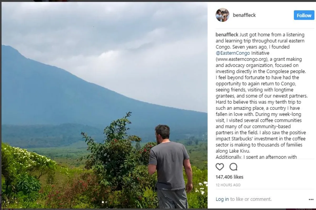 وصل الممثل العالميّ الشهير بن أفليك Ben Affleck إلى الكونغو منذ أيام، حيث نشر على حسابه الخاص على أحد مواقع التواصل الاجتماعي، صورة من الزيارة.