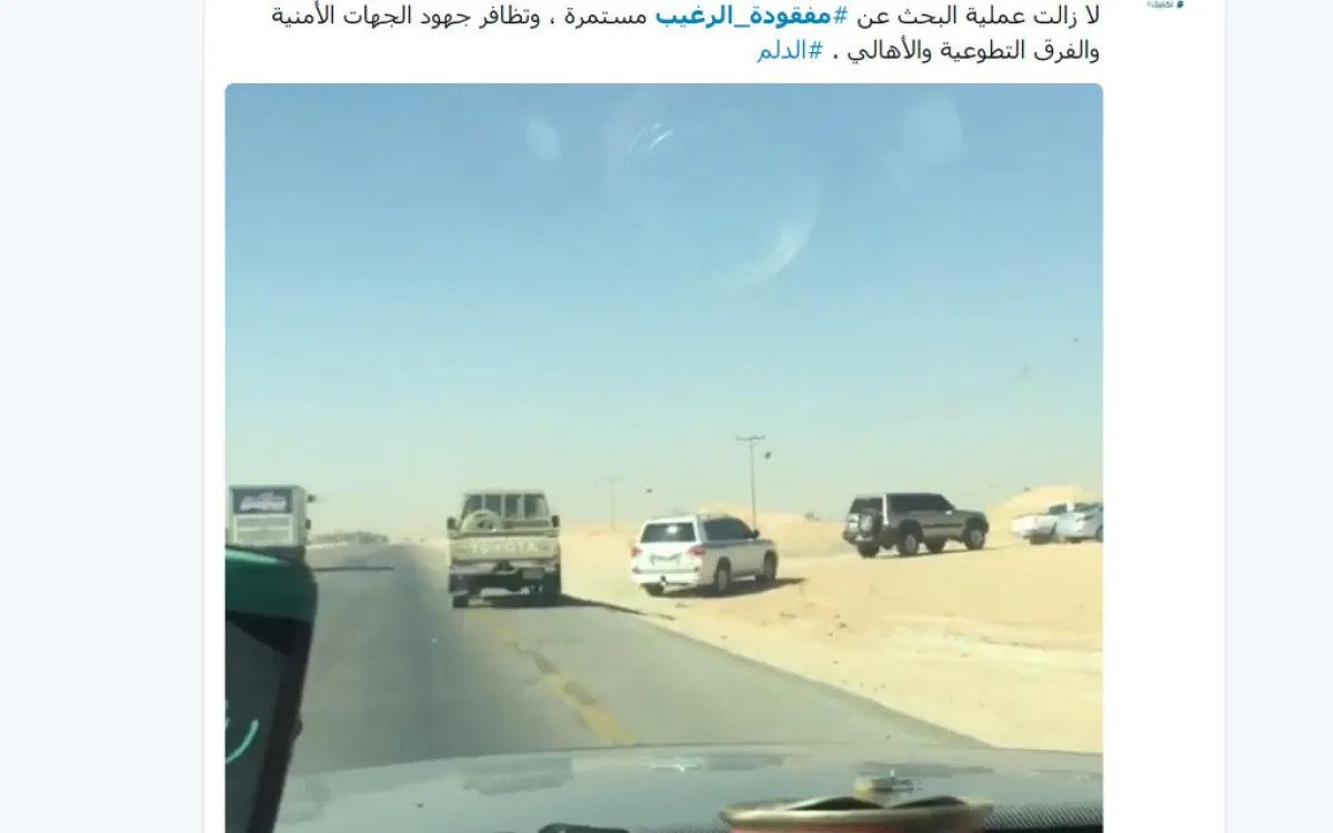 وذكر عبر "تويتر" أن عملية البحث عن #مفقودة_الرغيب مازالت مستمرة، وتضافر جهود الجهات الأمنية والفرق التطوعية والأهالي، وتم تحرك أكثر من ٢٠ عضواً من فريق "عون" للإنقاذ، كما تم البحث عن الفتاة عن طريق الطائرات التابعة لفريق "غوث" التطوعي، فيما أعلن نادي سماء الخرج للطيران عن جاهزيته للطلعات الجوية للبحث عن #مفقودة_الرغيب جنوب #الدلم.