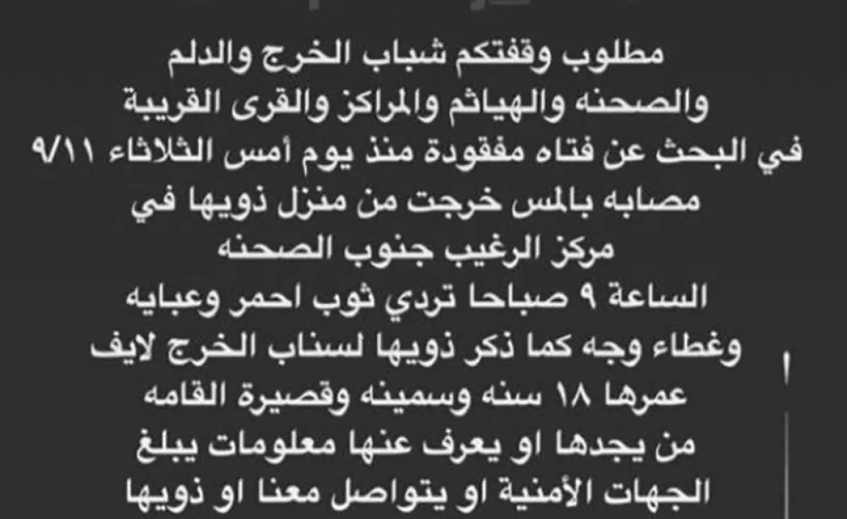 حملة بحث مكثفة بدأت أمس في إحدى المدن السعودية بعد اختفاء فتاة تبلغ من العمر " 18 عاماً" في ظروف غامضة، وشهد موقع "تويتر" حملة للبحث عنها عبر هاشتاق "#مفقودة_الرغيب".