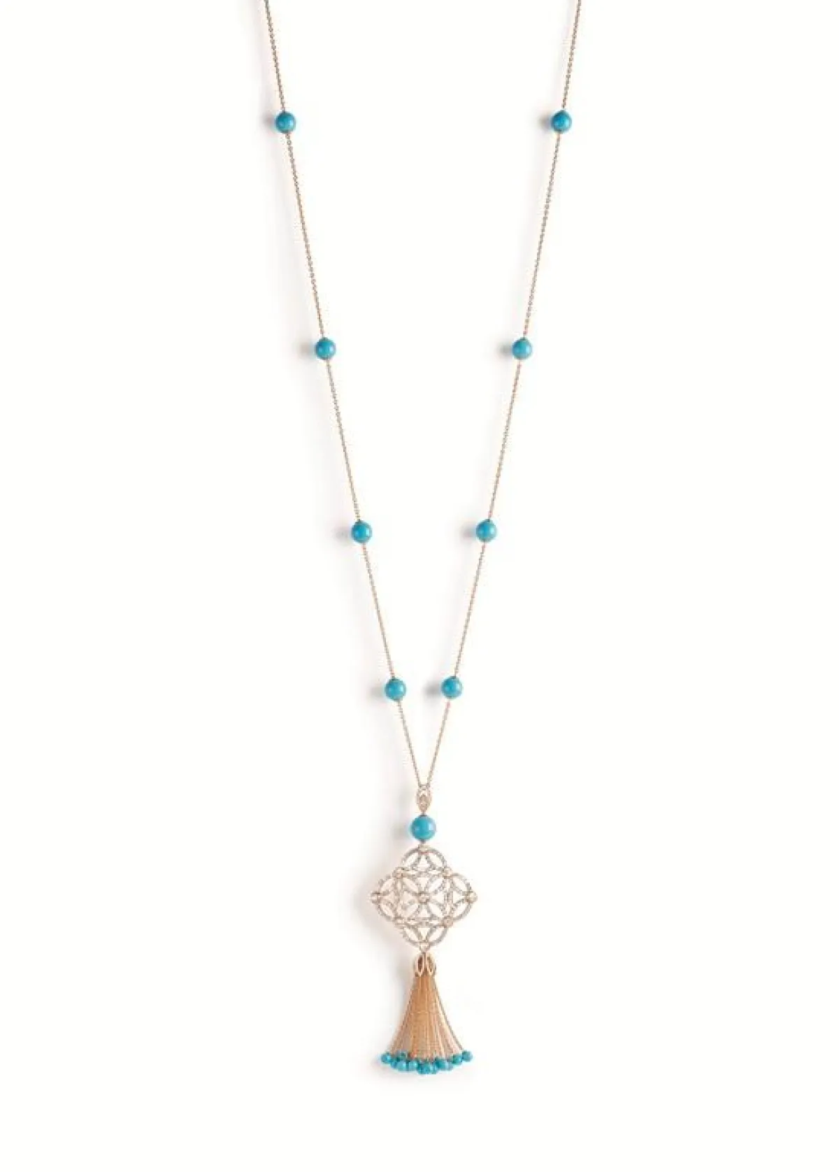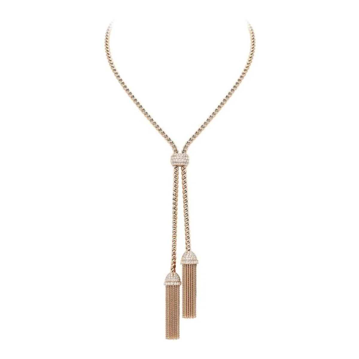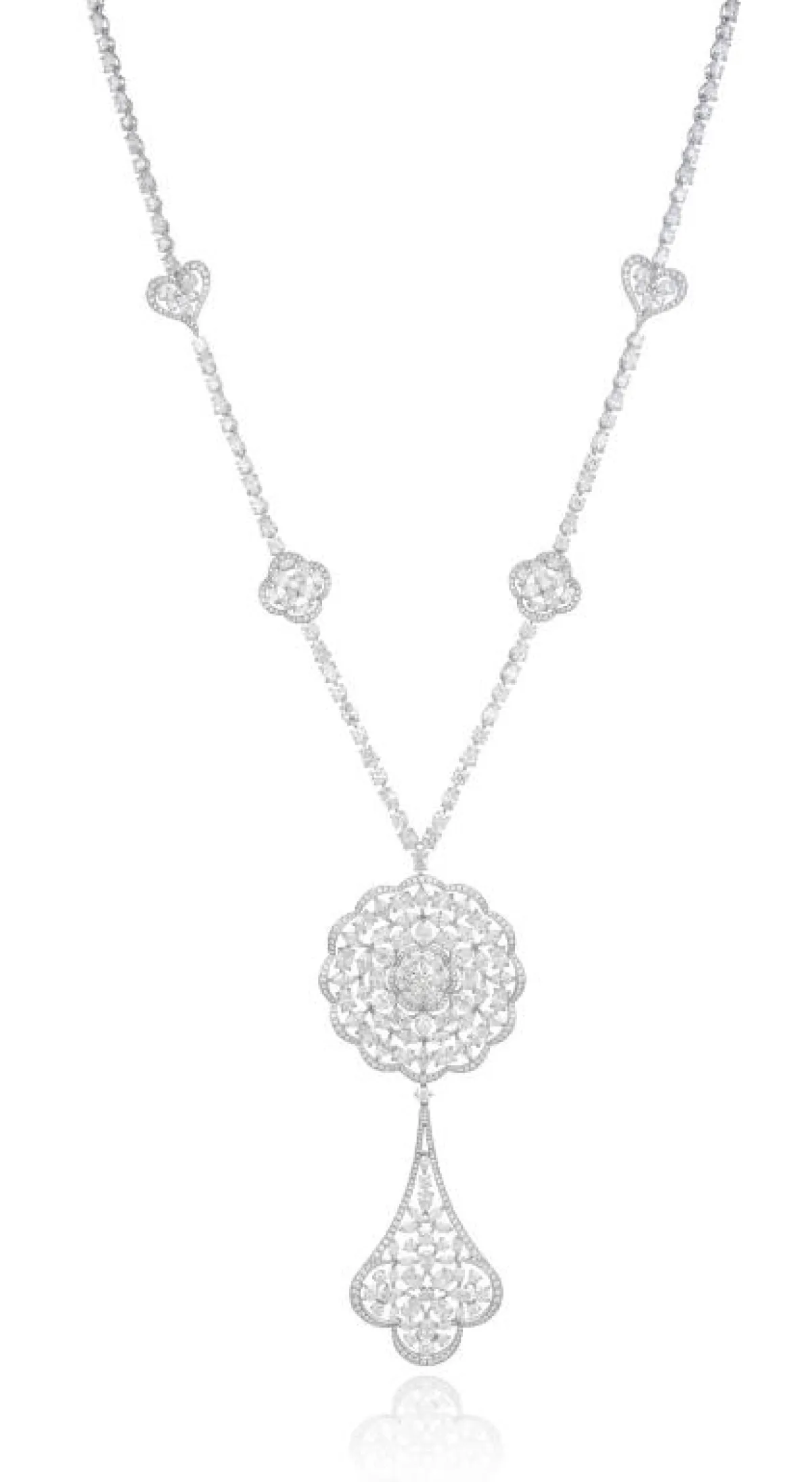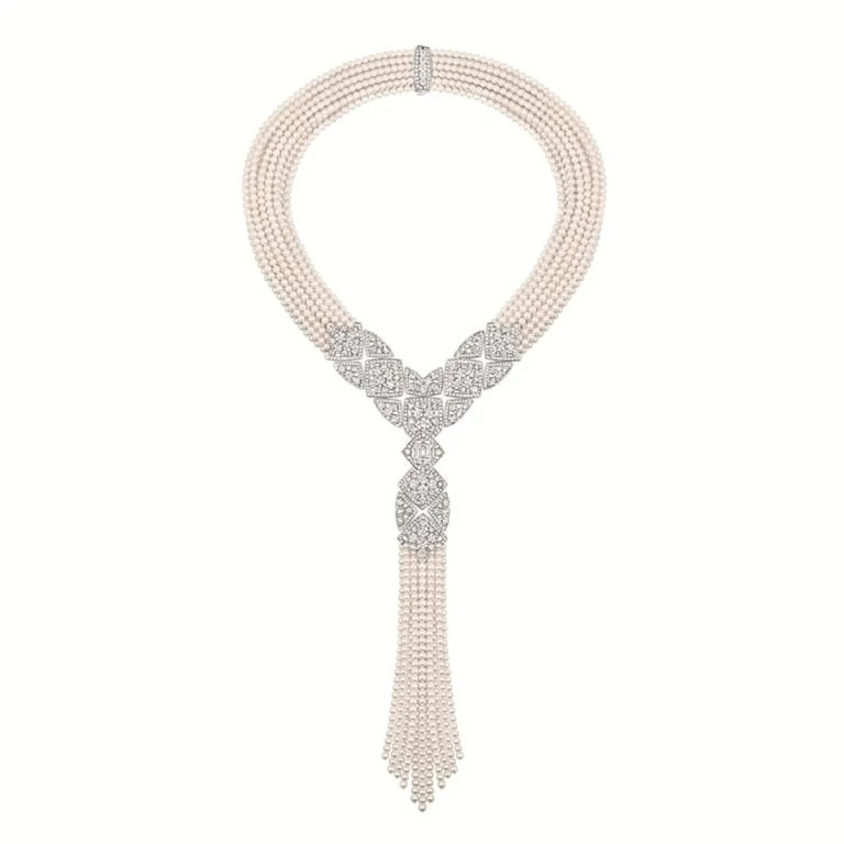 كما لفتنا تصميم العقد المصنوع من اللؤلؤ والماس على شكل شراريب مميزة، من مجموعة "سيغناتشور دو شانيل" Signature de Chanel من "شانيل" Chanel، والذي يشبه شكل الثريا المتدلية وهو يليق بأهم المناسبات بفضل تصميمه الفاخر والغني.