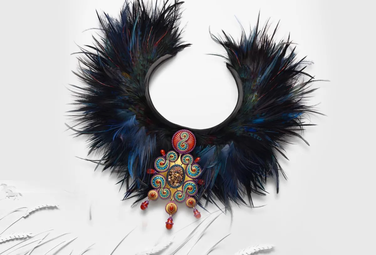 بعض التصاميم التي قدّمتها الدور العالمة جاءت غريبة وجريئة، مثل هذا العقد من مجموعة "ريد كاربت" Red Carpet من "شوبارد" Chopard والتي قدّمته الدار هذا العام. والمميز بهذا العقد أنه مصنوع من أفخر أنواع الأحجار الكريمة والمعادن ومغطى في الوقت نفسه بالريش المتموّج الألوان.