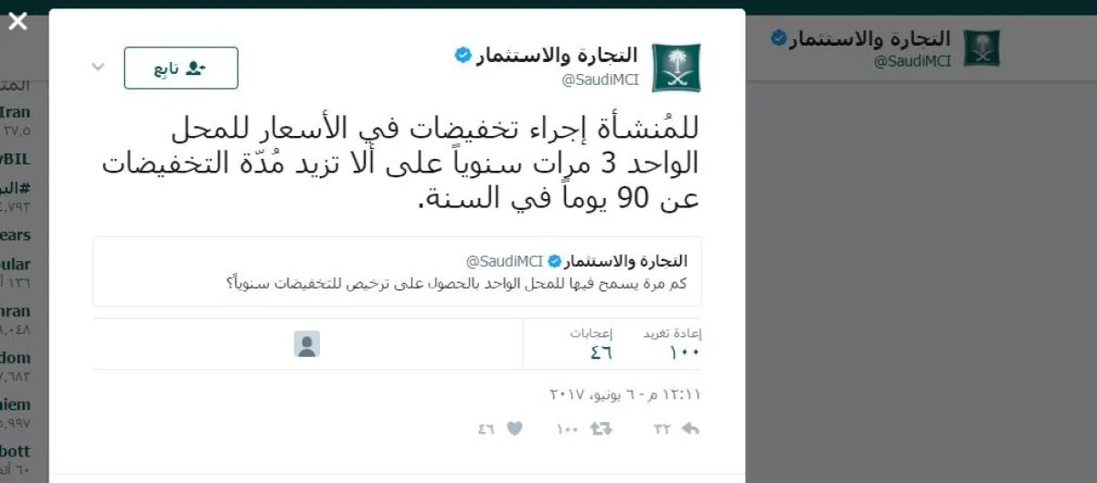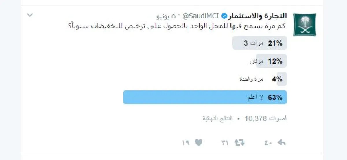 قامت وزارة التجارة والاستثمار السعودية بنشر سؤال في حسابها على موقع "تويتر"، يتضمن تصويتاً، وهو: كم مرة يسمح فيها للمحل الواحد بالحصول على ترخيص للتخفيضات سنوياً؟