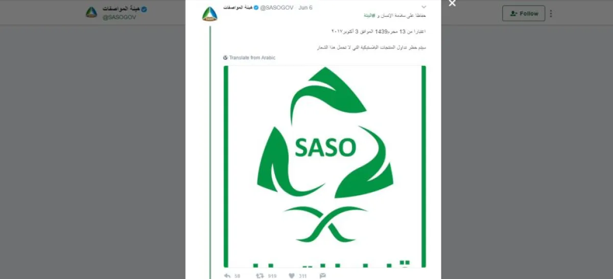 وغردت "الهيئة" في حسابها على "تويتر" قائلة: "حفاظاً على سلامة الإنسان والبيئة، فإنه سيتم اعتباراً من 13 محرم 1439 هـ، الموافق 3 أكتوبر ٢٠١٧ م، حظر تداول المنتجات البلاستيكية التي لا تحمل هذا الشعار". ووضعت صورة للشعار.