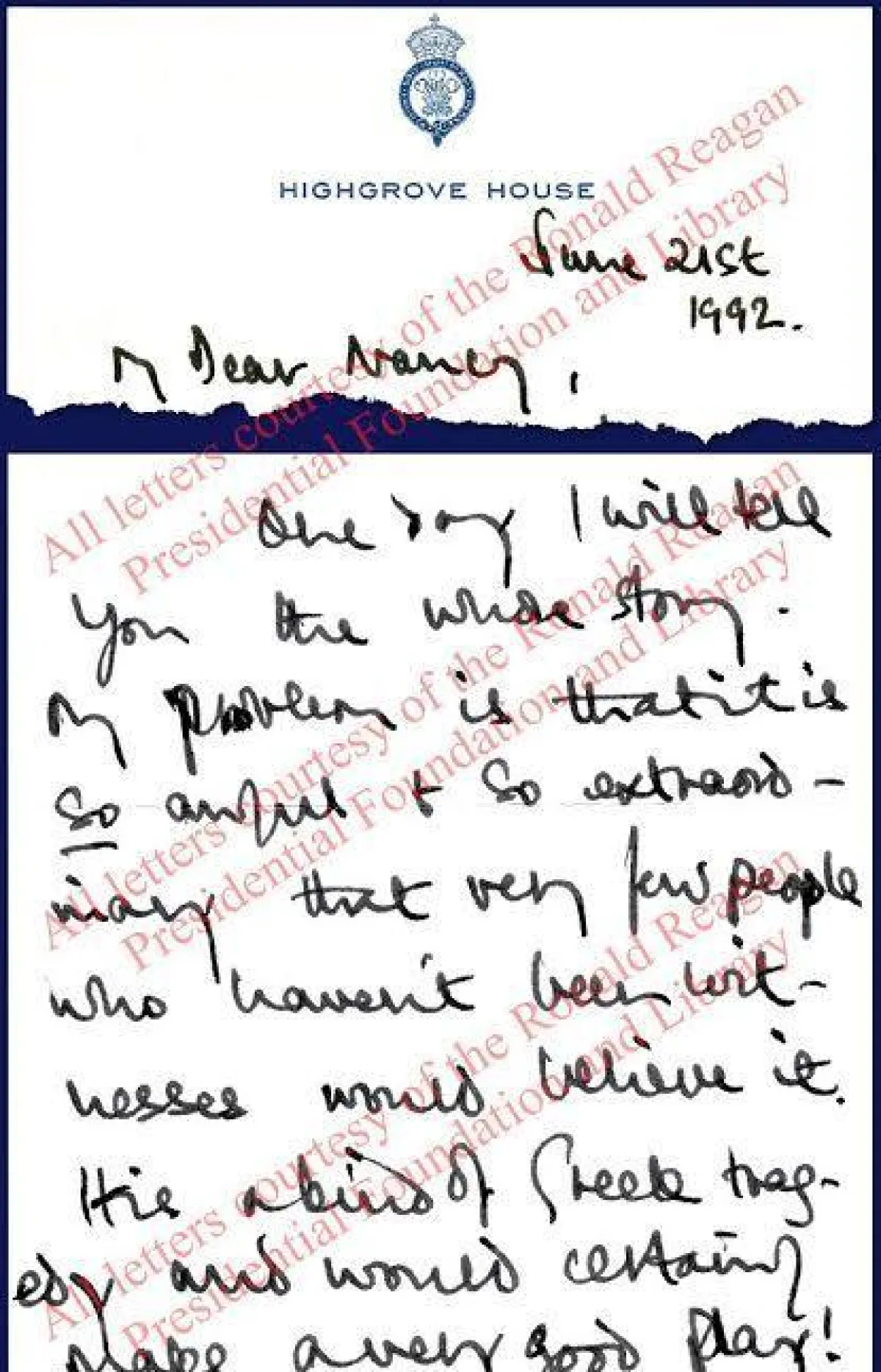 وأُرسلت هذه الرسالة، بتاريخ الـ 21 من حزيران/يونيو عام 1992، إلى نانسي ريغان، وشكلت هذه الرسائل العمود الفقري للصداقة، التي امتدت على مدى 4 عقود، وانتهت بوفاة ريغان في عمر الـ 94.