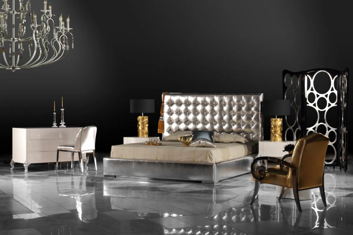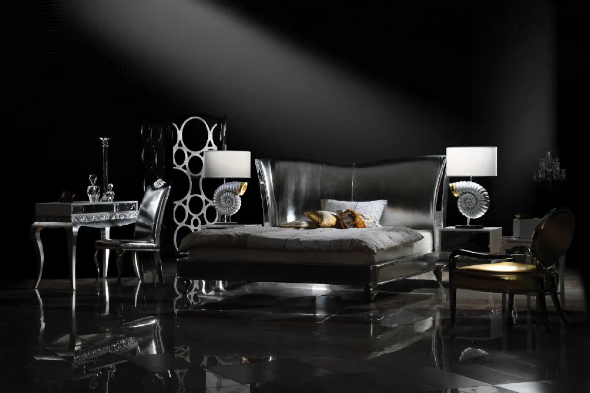 * غرفة النوم: الفخامة هي الصفة التي تطلبها الغالبيّة لغرف نومها، من هنا يبرز طابع "الرويال" للأثاث، وقوامه الجلد الطبيعي الذهبي أو الفضي، مع سرير منخفض ذي ظهر يشبه التاج. ويُنصح باستخدام عدد محدّد من الـ"اكسسوارات" الصغيرة، مع الطراز "الرويال" الجلدي، مع اللجوء إلى إضاءات جانبيّة خافتة مريحة للنظر، ووضع المرايا على الجدران ما يشي بالفساحة، كما يعكس بريق اللونين الفضّة والذهب. ويُستحسن اختيار ثريا كلاسيكيّة للغرفة ذات الجدران المطليّة بلون مشتقّ من الرمادي والأسود، لإبراز بريق الجلد الذهبي أو الفضّي، مع فرد سجّادة داكنة اللون وذات وبر بارز وسط الغرفة.