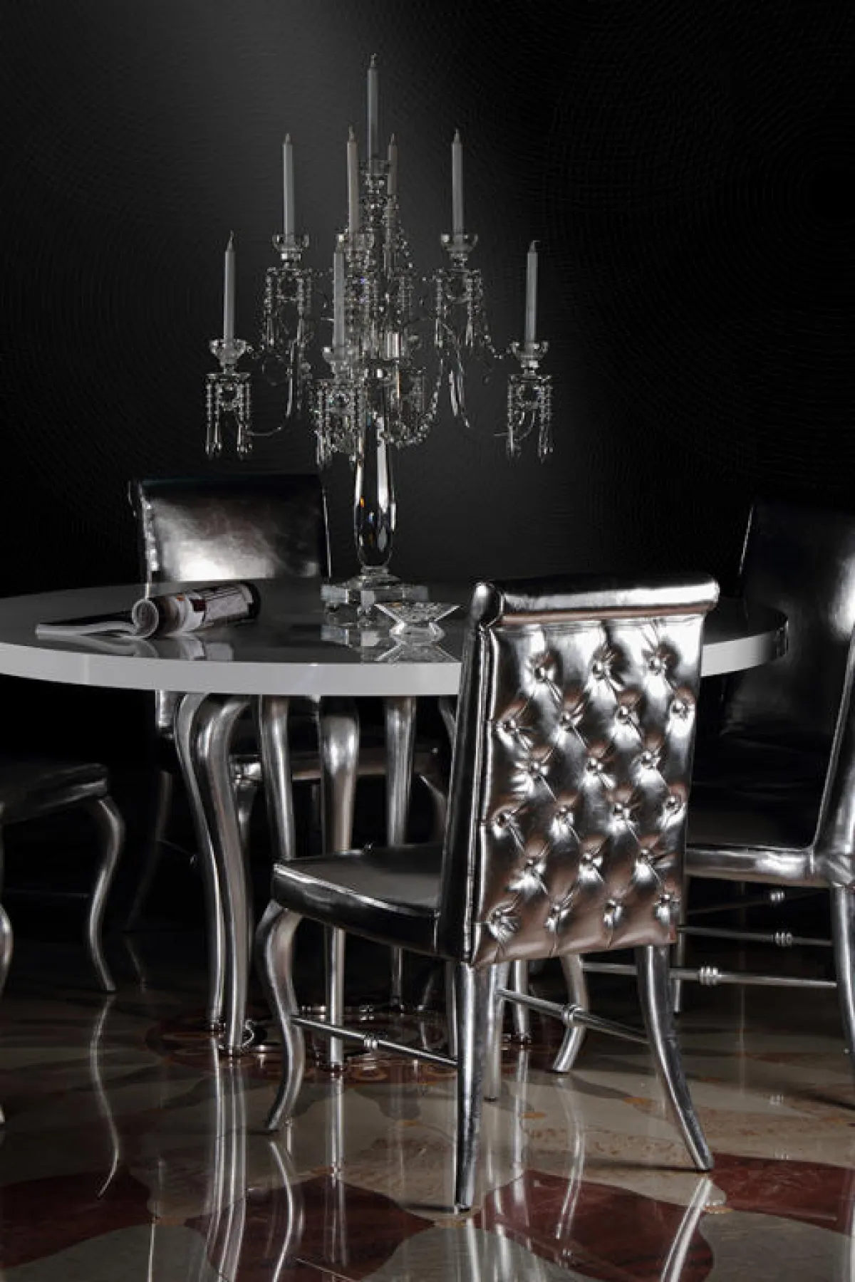 إن كراسي غرفة الطعام المعدّة من الجلد بلون الفضّة تحقق إيحاءً وهميًّا بالفساحة