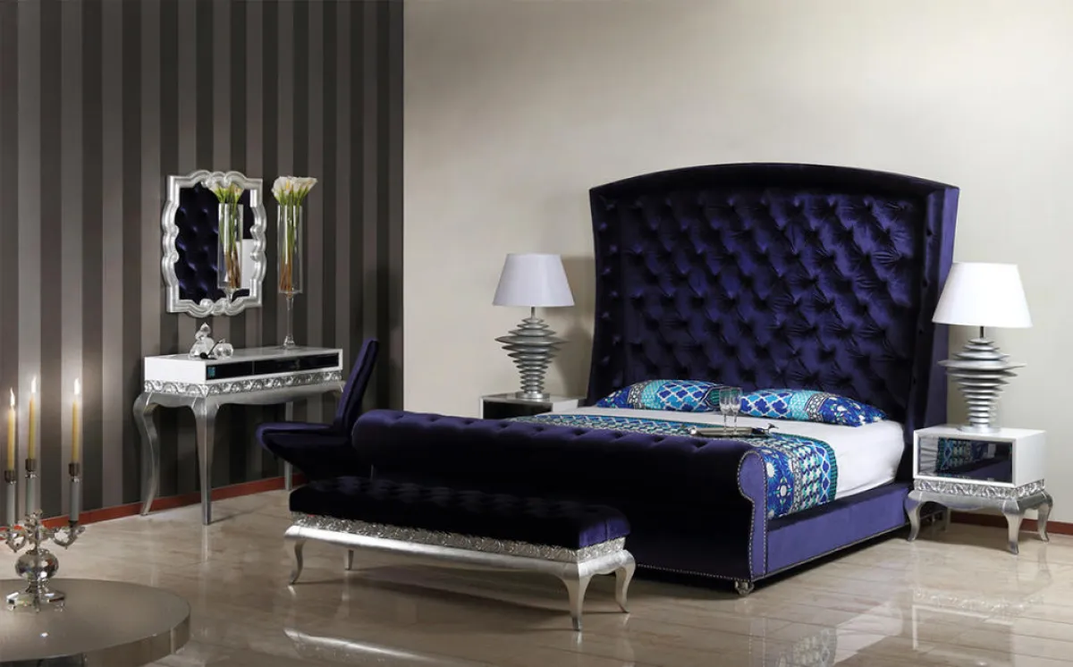 في غرفة النوم، يناسب الطراز "الرويال" السرير المنخفض ذا الظهر الشبيه بالتاج