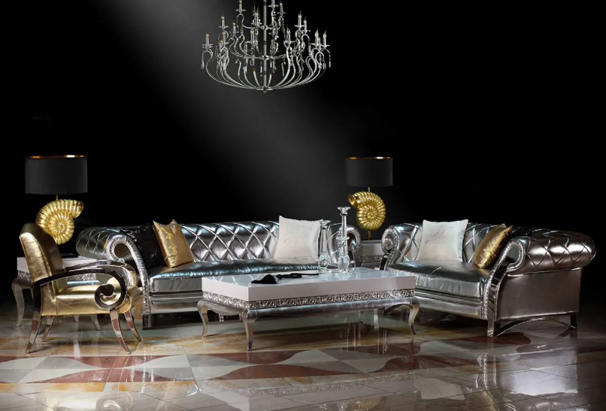 من الممكن تحقيق الطراز "الرويال" في الصالون، عبر تأثيثه بطقم مشغول من الجلد المرصّع بالأزرار، بأحد اللونين الذهبي أو الفضي