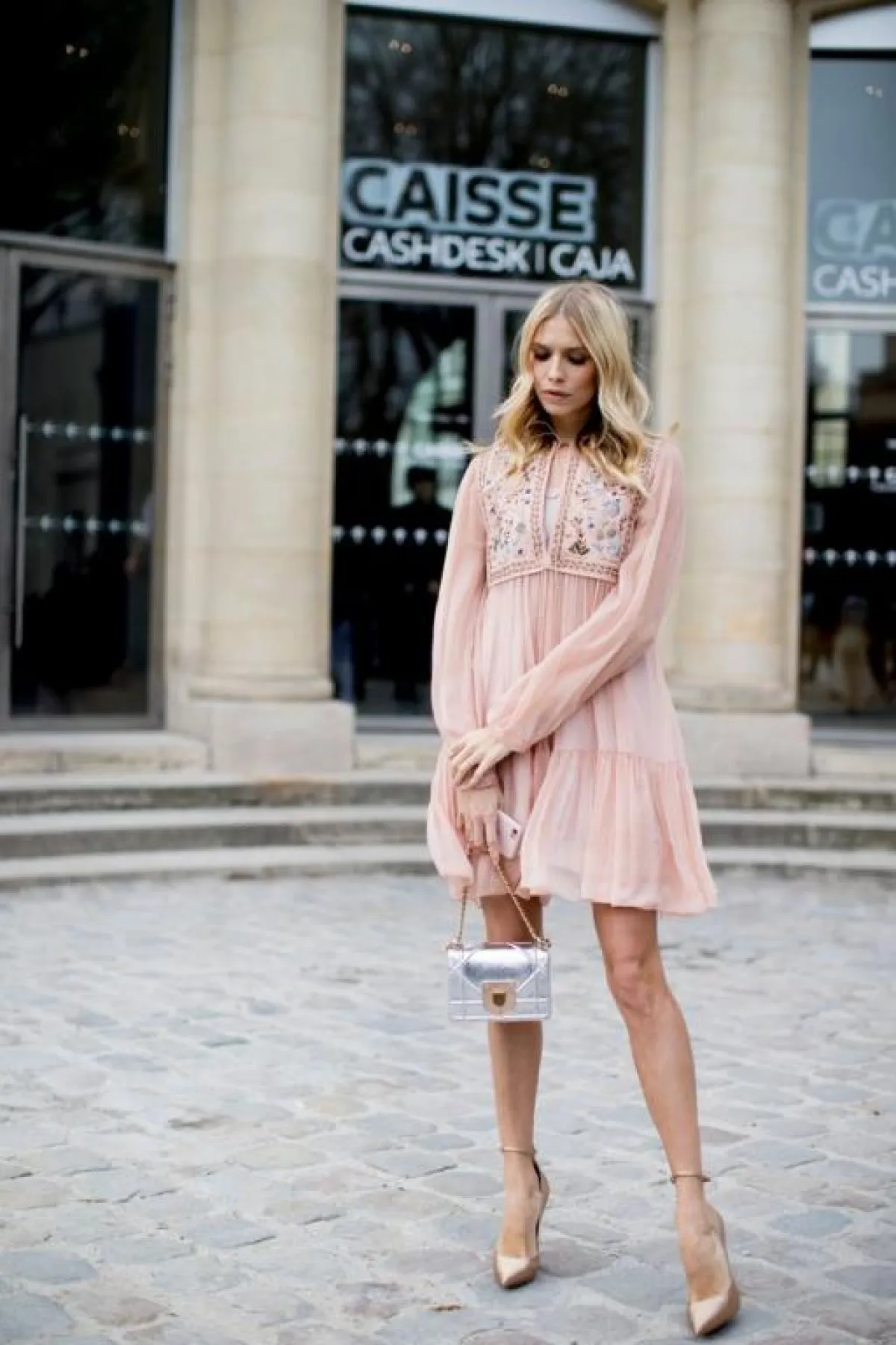 تفاصيل هذه الأزياء الباريسية وخاصة الزهيرات الصغيرة المنقوشة على فستان من الأورغنزا، و كذلك بعض الرسومات التي تعكس معاني الحب والحنين، ولتكون طلتك أكثر أنوثة وترفاً نسقيها بحقائب يد صغيرة ذات سلاسل مذهبة وأحذية بكعب عال ذات لون فضي أو بيج .