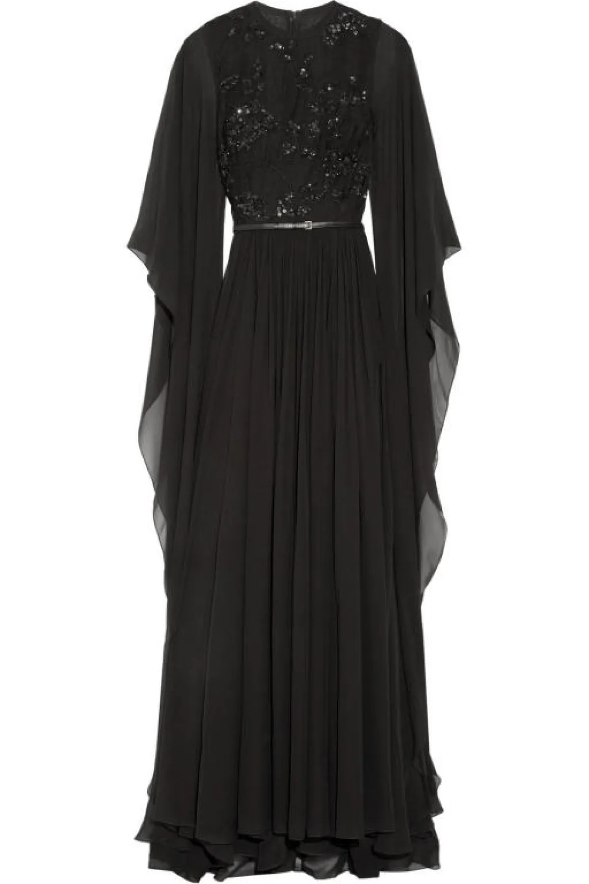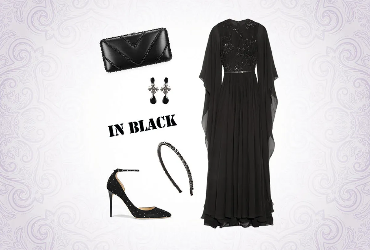 لا يوجد لون ينافس اللون الأسود بالأناقة والرقي، وخاصة على ملابس السهرات الفاخرة، لذلك فان معظم النساء يخترن الأسود للمناسبات الرسمية والكبيرة. ولإطلالتك في رمضان، اخترنا لك فستاناً مستوحى من تصميم الجلابيات، مصنوع من قماش الشيفون الشفاف ومطرّز بحبات الترتر.