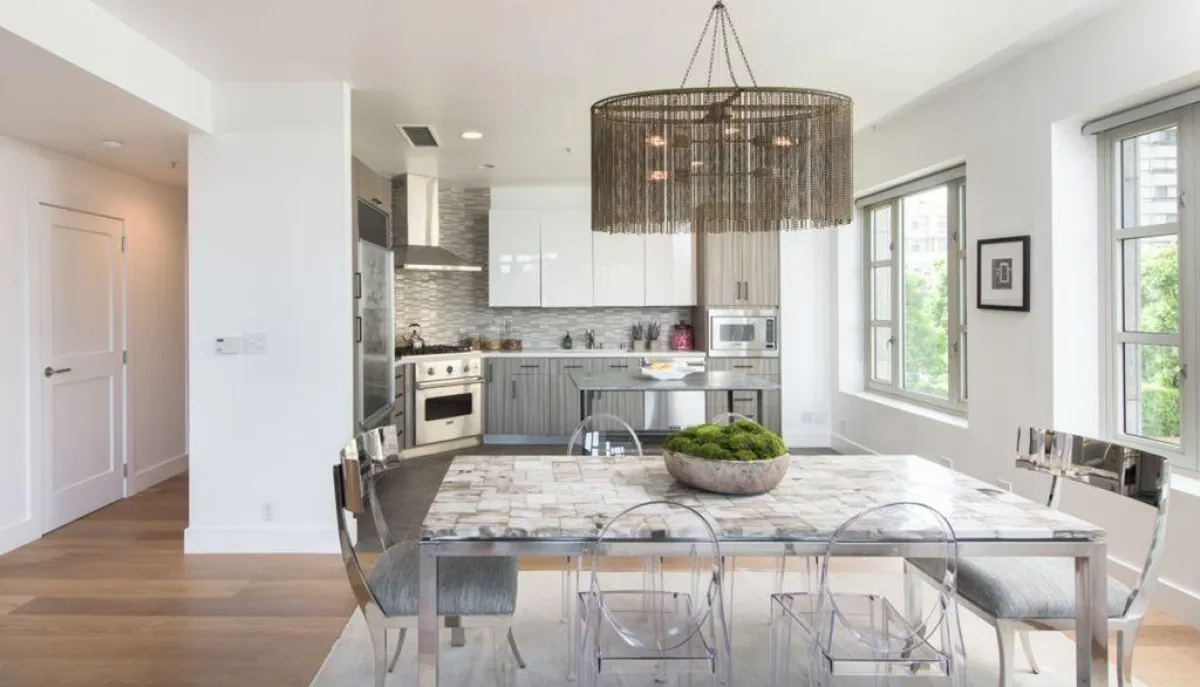 تبدو عناصر ركن الطعام، من ناحيتها، مختارة بإتقان، وهي تشي بالفخامة، وتبعد عن التقليديّة، إذ تحوط الكراسي الشفّافة الطاولة، ما يضفي انشراحًا على المساحة. وتلفت في الركن المذكور، الثريا المتدلية من السقف، بتصميمها المعاصر.