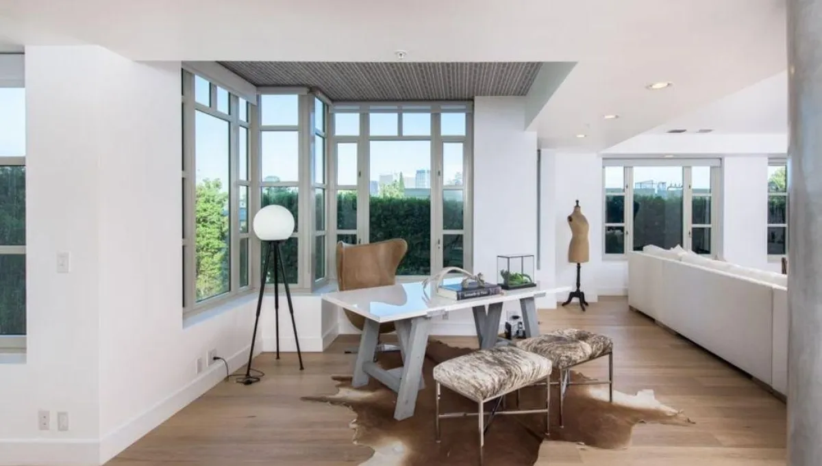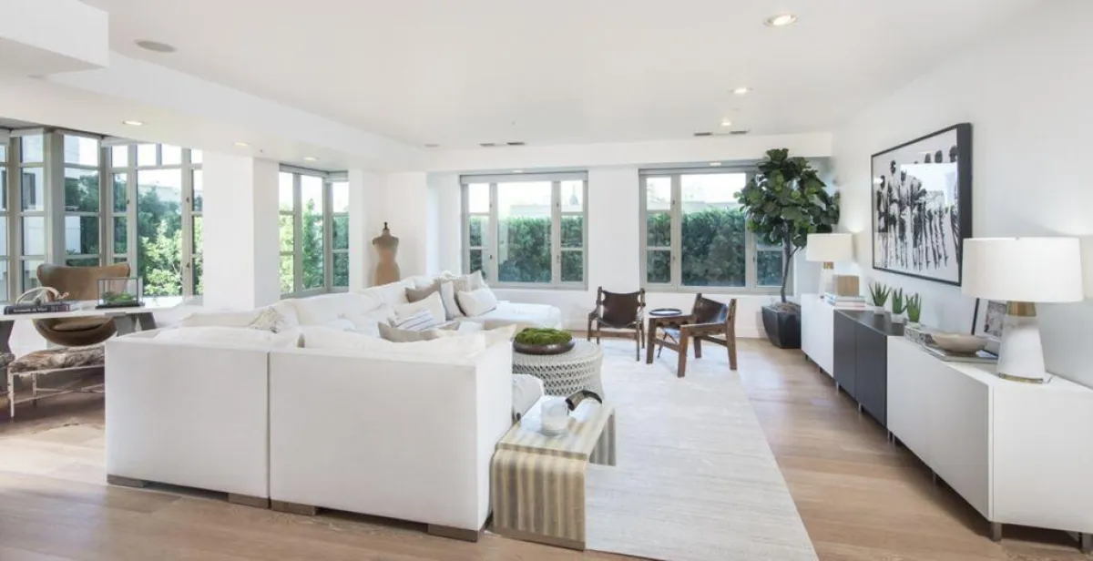 يقع العقار في ممر "ويلشاير"، ويمتدّ على مساحة 200 متر مربع، ويضمّ غرفتي نوم وثلاثة حمّامات. كما يطلّ على المساحات الخضر، التي تحوط البناء. وفي دواخله الفسيحة والمخليّة من الفواصل، الدواخل التي تحظى بنور الشمس، تلفت الأسقف عالية، والألوان الفاتحة في الـ"ديكورات"، التي تشيع شعورًا بالراحة، ولا سيّما في مساحة الاستقبال، حيث يسيطر الأبيض على الجدران والسقف، فيما يغطّي خشب الـ"باركيه" فاتح اللون الأرضيّات. أمّا في الصالون، فيظهر اختيار النجمة لقطع الأثاث وتوزيعها بطريقة مدروسة ذوقها الرفيع، إذ تتألّق هذه المساحة بديكورها الأنيق، مع طغيان الأبيض على المكوّنات، فيما يتسلّل الأخضر إليها عبر الشتول. وتلفت اللوحة المعلّقة على الجدار الرئيس الأنظار.