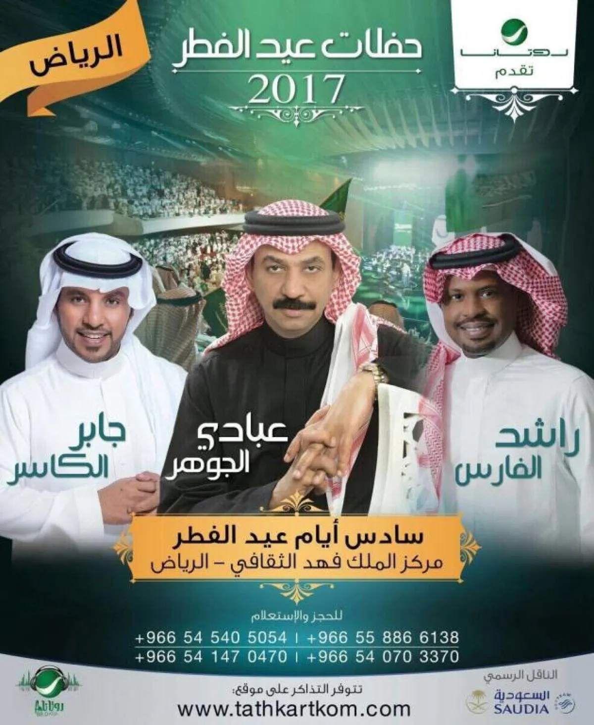 يحتضن مركز الملك فهد الثقافي في العاصمة الرياض، حفلة غنائية تجمع الفنانين: عبادي الجوهر وراشد الفارس وجابر الكاسر، وذلك سادس أيام عيد الفطر.