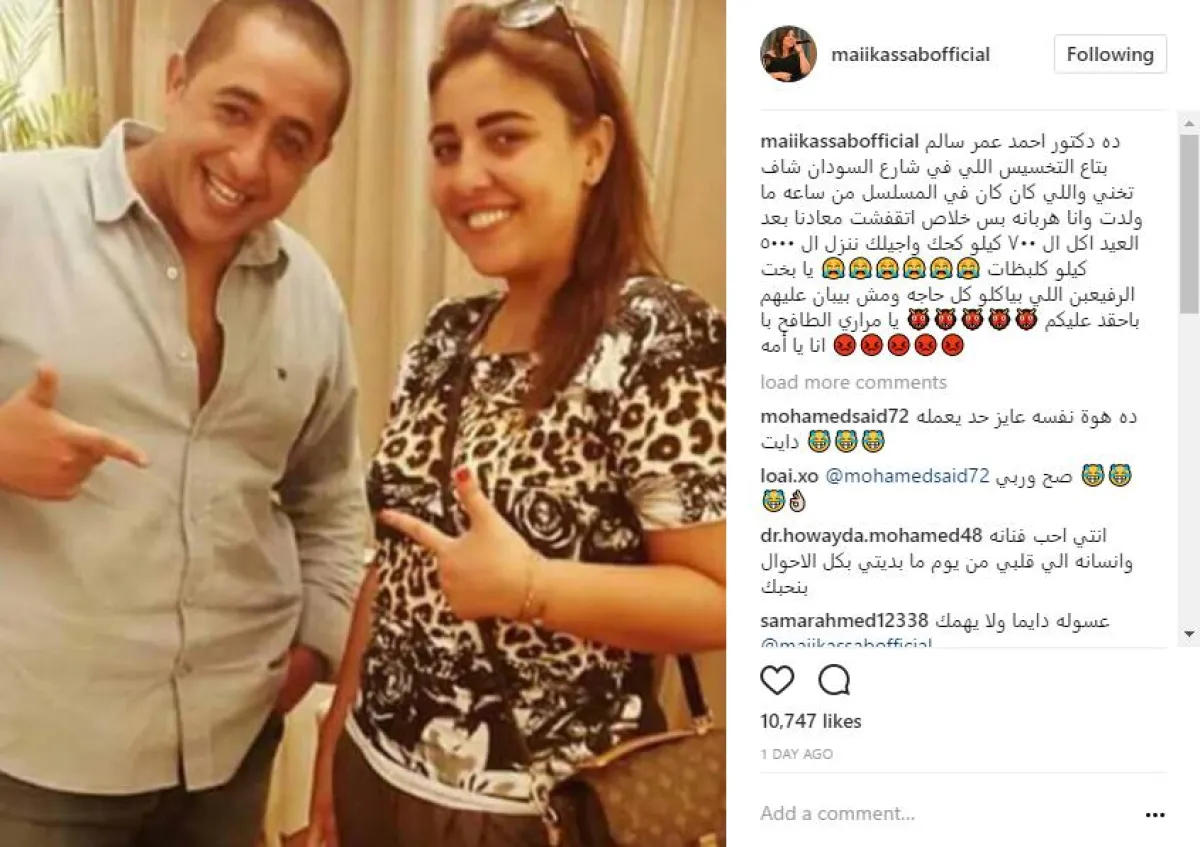 مي نشرت صورة لها مع طبيبها الخاص عبر حسابها بموقع انستقرام وعلقت عليها قائلة: "ده دكتور احمد عمر سالم بتاع التخسيس اللي في شارع السودان شاف تخني واللي كان في المسلسل من ساعه ما ولدت وانا هربانه بس خلاص اتقفشت معادنا بعد العيد اكل ال ٧٠٠ كيلو كحك واجيلك ننزل ال ٥٠٠٠ كيلو كلبظات يا بخت الرفيعين اللي بياكلو كل حاجه ومش بيبان عليهم باحقد عليكم يا مراري الطافح يا انا يا أمه".