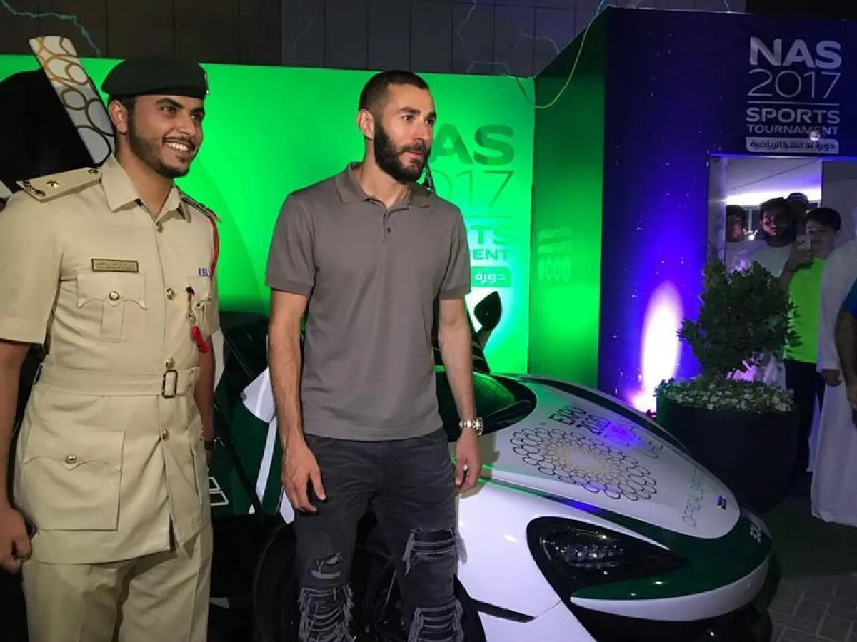 اصطحبت دورية تابعة لشرطة دبي، لاعب كرة القدم العالمي كريم بنزيمة في جولة سياحية في أرجاء الإمارة، على هامش حضوره دورة ناس الرياضية في دبي.
