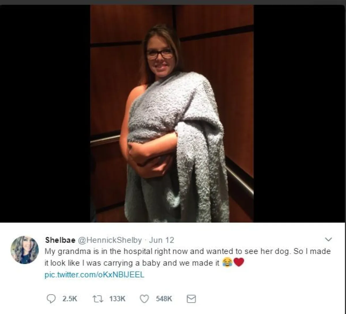 وفي التفاصيل، فإنّ الجدة المريضة توجد في مستشفى تمنع دخول الكلاب، وبما أنّ هذا الأمر ضايق الجدة كثيرًا، قررت شيلبي أن تتبع حيلة ذكية جدًّا، لتحتال على الأمن، وتتمكن من إدخال الحيوان الصغير إلى داخل المستشفى.