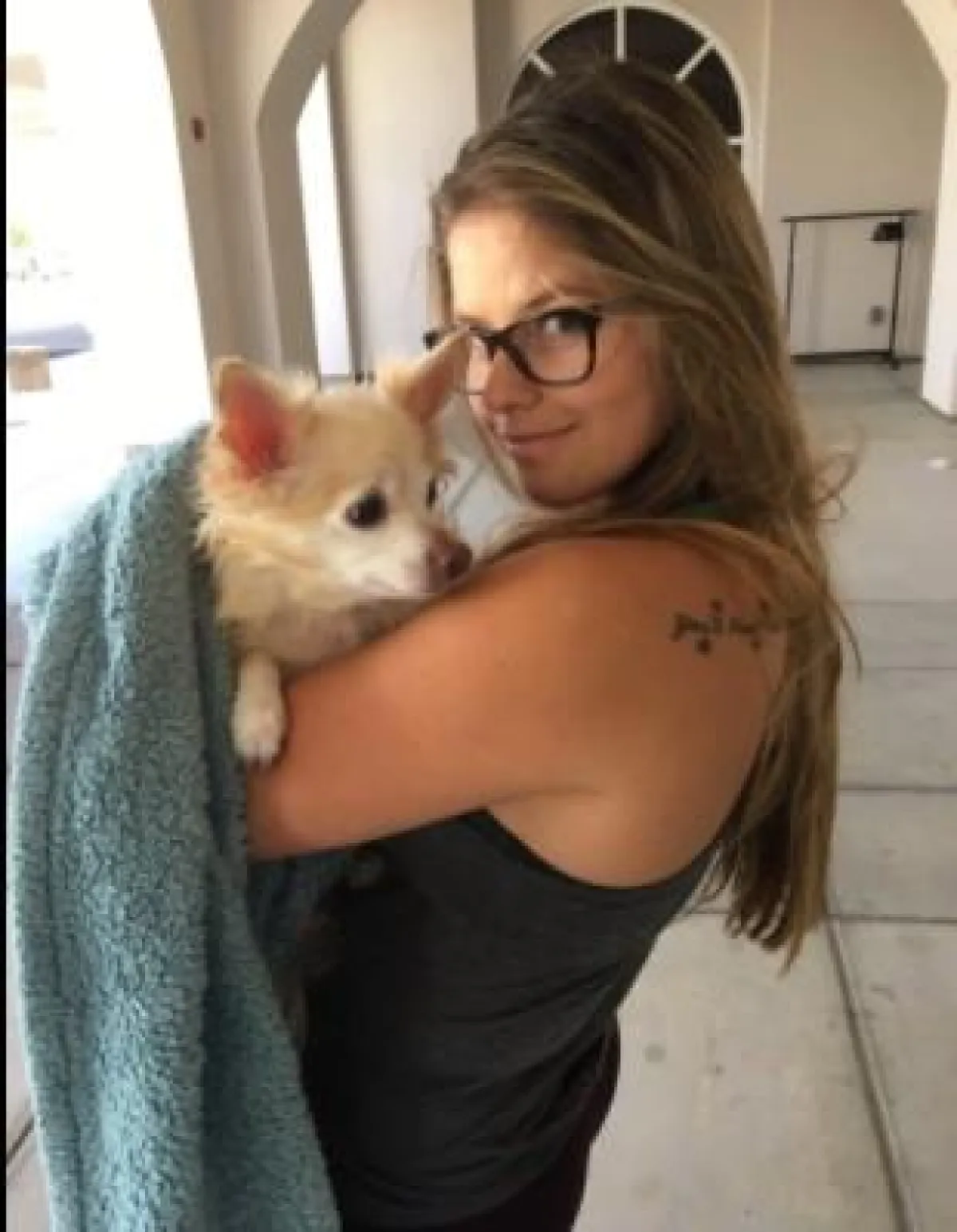 وقامت شيلبي بتغطية الكلب بغطاء، وحملته بطريقة، ليبدو وكأنها تحمل طفلًا صغيرًا في أحضانها.