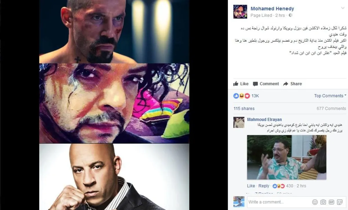 هنيدي نشر صورة مجمعة له وبجانبه فان ديزل بطل سلسلة fast and furious، وسكوت أدكنز بطل فيلم Boyka undisputed، وكتب معلقاً عليها "شكرا لكل زملاء الاكشن فين ديزل وبويكا وارنولد شوال رنجة بس ده وقت هنيدي أكبر فيلم أكشن منذ بداية التاريخ دم وعضم بيتكسر ورجول بتطير هنا وهنا واللي بيخاف يروح".