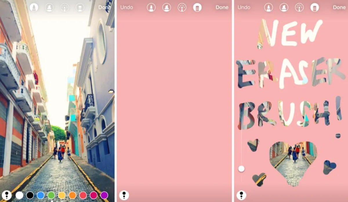| فرشاة ممحاة جديدة: إنّ أدوات الرسم على "انستقرام" واسعة، أبرزها ممحاة جديدة تمكّن المستخدم من محو خطأ صغير، عوضًا من البدء من جديد مع زر "التراجع". عند اختياره هذه الأداة، يمكن مسح أية رسومات أضيفت إلى قصّة المستخدم. ولكن يمكن للأخير أيضًا استخدامها، لإنشاء "بطاقة" عبر فتح الـ"كاميرا" لالتقاط صورة أو "فيديو" على"انستقرام"، فتحديد أداة الرسم والنقر لثلاث ثوانٍ لملء الشاشة بأكملها مع اللون. ثم، باستخدام فرشاة ممحاة، يمكن الكشف عن أجزاء من صورتك أو الفيديو تحت "البطاقة".