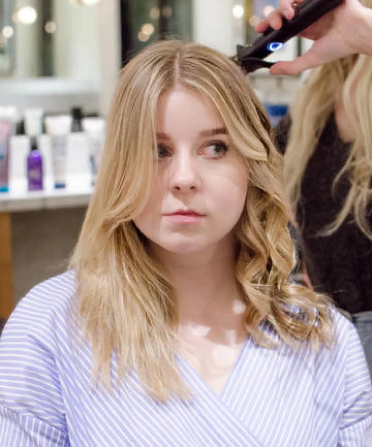 5.المكواة المموجة: استخدمي المكواة الخاصة بتمويج الشعر، وعليكِ البدء بشعرك السفلي والانتهاء بالشعر الأمامي، مع تجنب قرب عصا المكواة من وجهك، وعند استخدام المكواة، قومي بلف شعركِ عليها، واتركيه لثوانٍ عدة، للحصول على تموج ثابت.