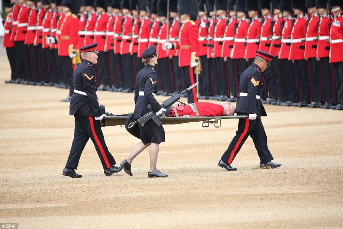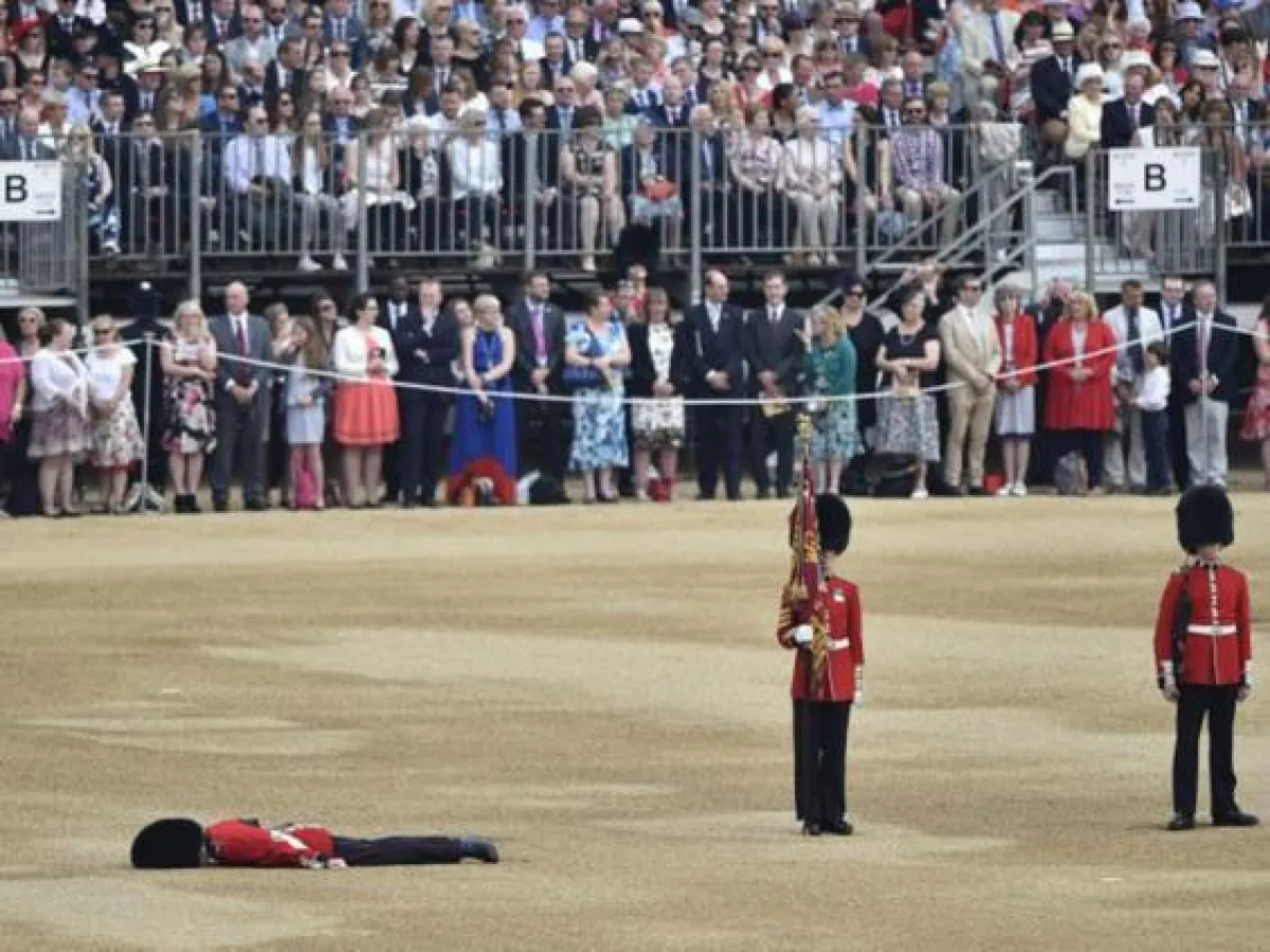خلال الإحتفال بذكرى ميلاد الملكة إليزابيث الثانية Elizabeth الـ 91 في العاصمة البريطانية لندن، سقط 5 من عناصر الحرس الملكي مغمى عليهم أثناء العرض، بسبب قبعات الفرو التي كانوا يرتدونها، في طقس تجاوزت فيه درجات الحرارة الـ 25 درجة مئوية.