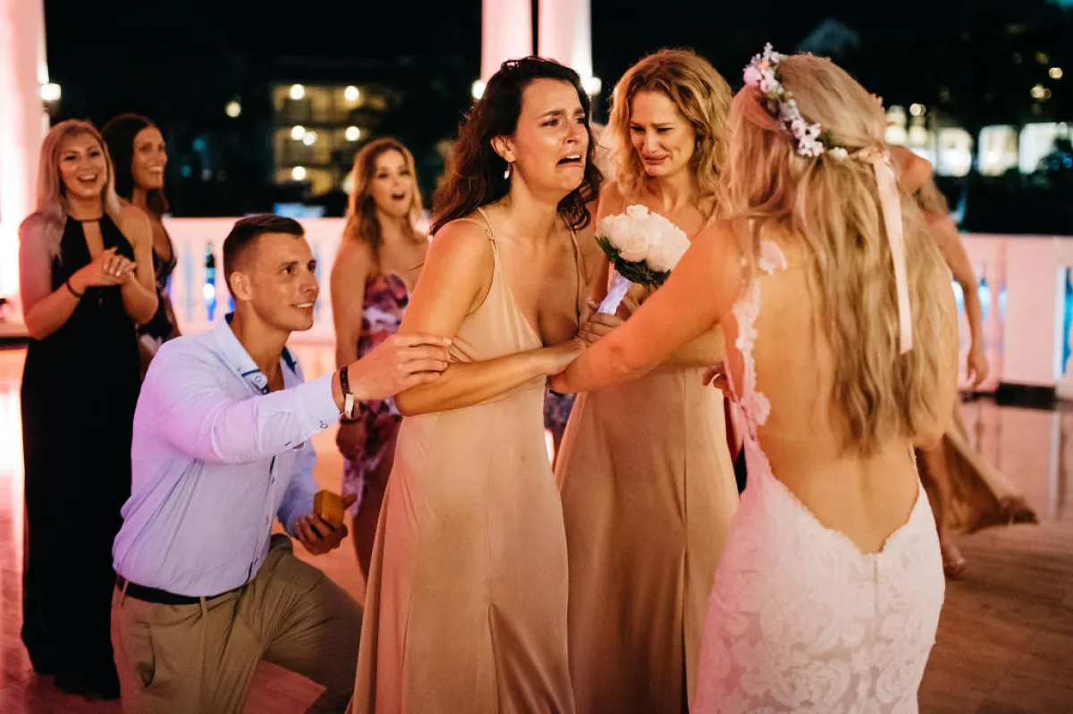 وقامت العروس جيس نارايكو بتقديم باقة زهورها إلى صديقتها ووصيفتها جيسيكا كايلي، ليتدخَّل صديق الأخيرة آدم برايك، ويطلب يدها بطريقة رومانسية فاجأتها، لتنهمر دموعها من السعادة.