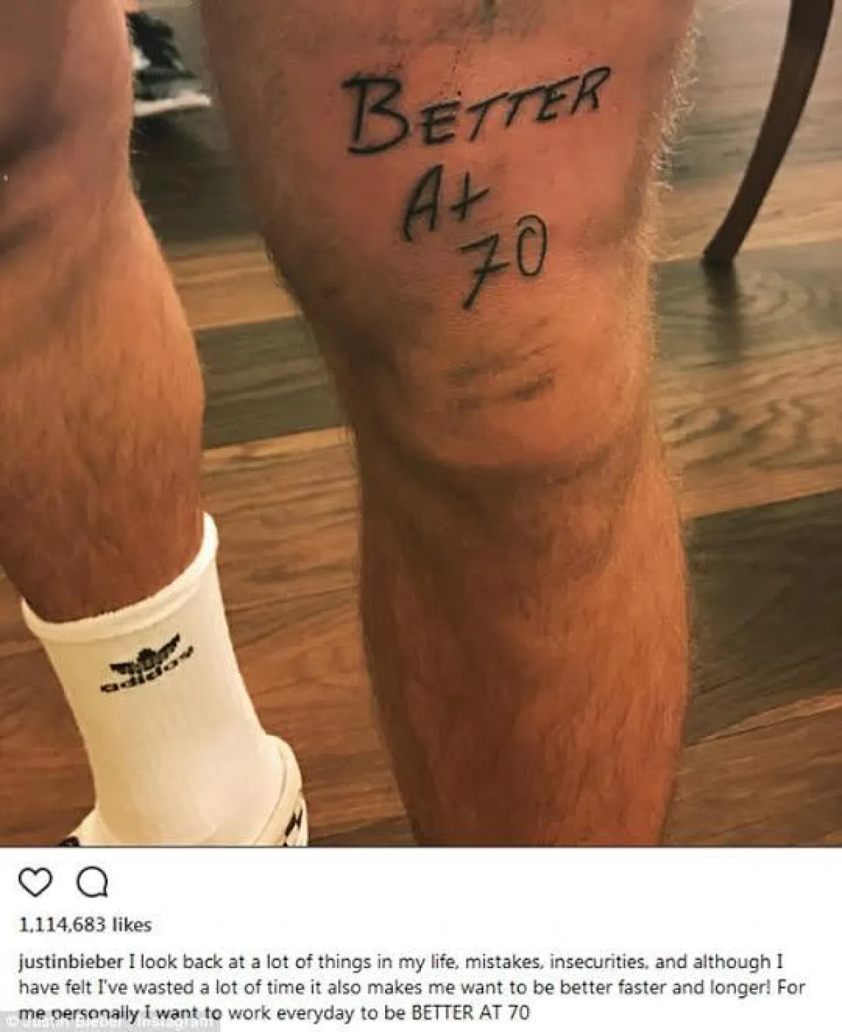 وأرفق جاستن الصورة بتعليق جاء فيه: "أتطلع إلى الوراء في الكثير من الأشياء في حياتي، كالأخطاء وانعدام الأمن، وعلى الرغم أنني شعرت أنني أهدرت الكثير من الوقت، فإنّ ذلك جعلني أسعى بقوة إلى أن أكون أفضل وأسرع وأطول..على المستوى الشخصي أريد أن أعمل كل ما بوسعي كل يوم، لأكون أفضل بعمر الـ70.