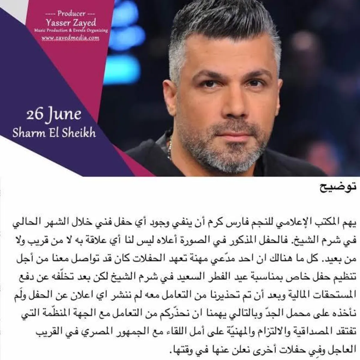 فارس كرم نشر الصورة الدعائية للإعلان المزعوم عبر صفحته الرسمية على موقع "تويتر" وعلق عليه: "يهم المكتب الإعلامي للنجم فارس كرم أن ينفي وجود أي حفل فني خلال الشهر الحالي في شرم الشيخ، فالحفل المذكور في الصورة أعلاه ليس لنا أي علاقة به لا من قريب ولا من بعيد. كل ما هنالك أن أحد مدّعي المهنة تعهد الحفلات كان قد تواصل معنا من أجل تنظيم حفل خاص بمناسبة عيد الفطر السعيد في شرم الشيخ لكن بعد تخلّفه عن دفع المستحقات المالية وبعد أن تم تحذيرنا من التعامل معه لم ننشر أي إعلان عن الحفل ولم نأخذه على محمل الجد. وبالتالي يهمنا أن نحذركم من التعامل مع الجهة المنظمة التي تفتقد المصداقية والإلتزام والمهنية، على أمل اللقاء مع الجمهور المصري في القريب العاجل وفي حفلات أخرى نعلن عنها في وقته".