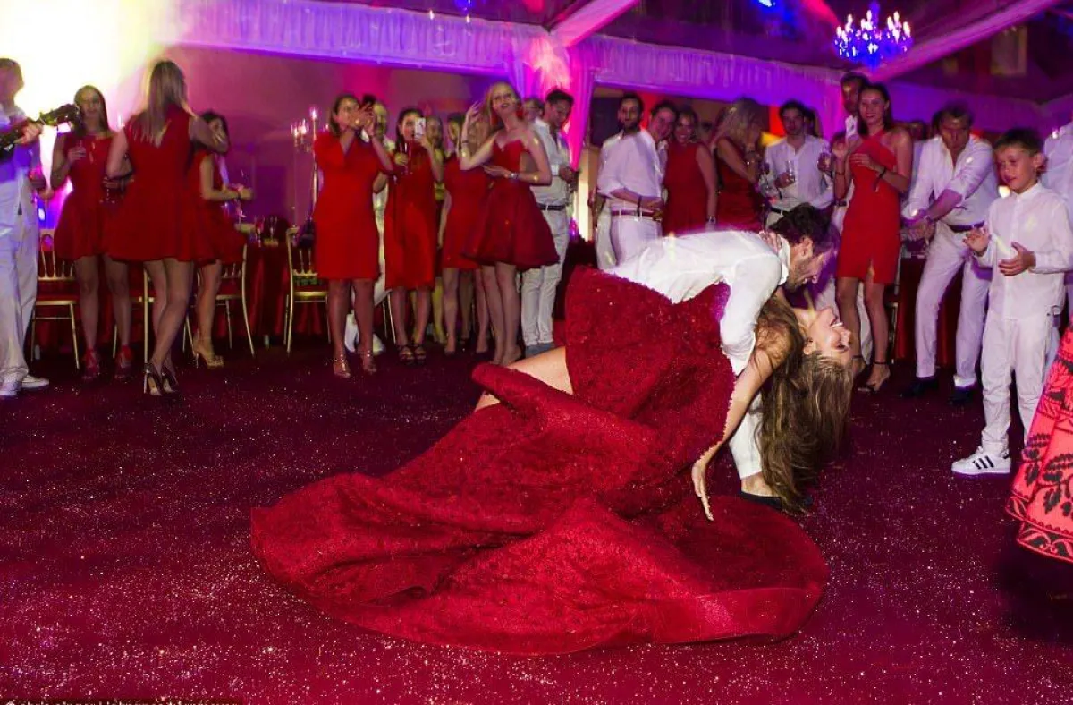 تألقت العروس بفستان زفاف مزين بأكثر من 500 ألف حبة سواروفسكي، وبلغ وزنه 46 كيلوغرامًا، من تصميمم مايكل كنكو Michael Cinco وأكمل الفستان بذيل بلغ طوله 8 أمتار، واختارت العروس حذاءًا مرصعًا بالسواروفسكي من ماركة جيمي شو Jimmy Choow. وخلال الحفل ارتدت العروس فستانين، الأول باللون الأبيض، والثاني باللون الاحمر الناري.