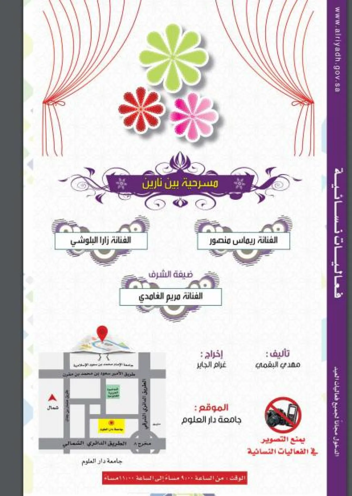 ستتم إقامة مسرحية بين نارين، ببطولة الممثلة ريماس منصور، والممثلة زارا البلوشي، والممثلة مريم الغامدي، في أول أيام عيد الفطر المبارك.