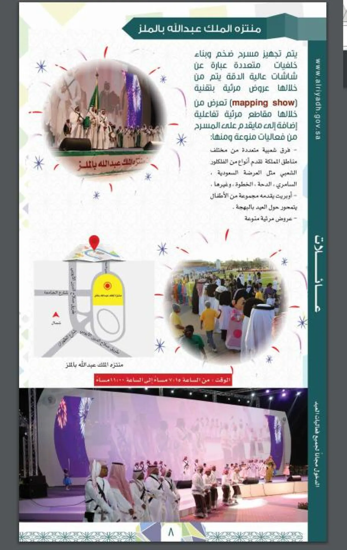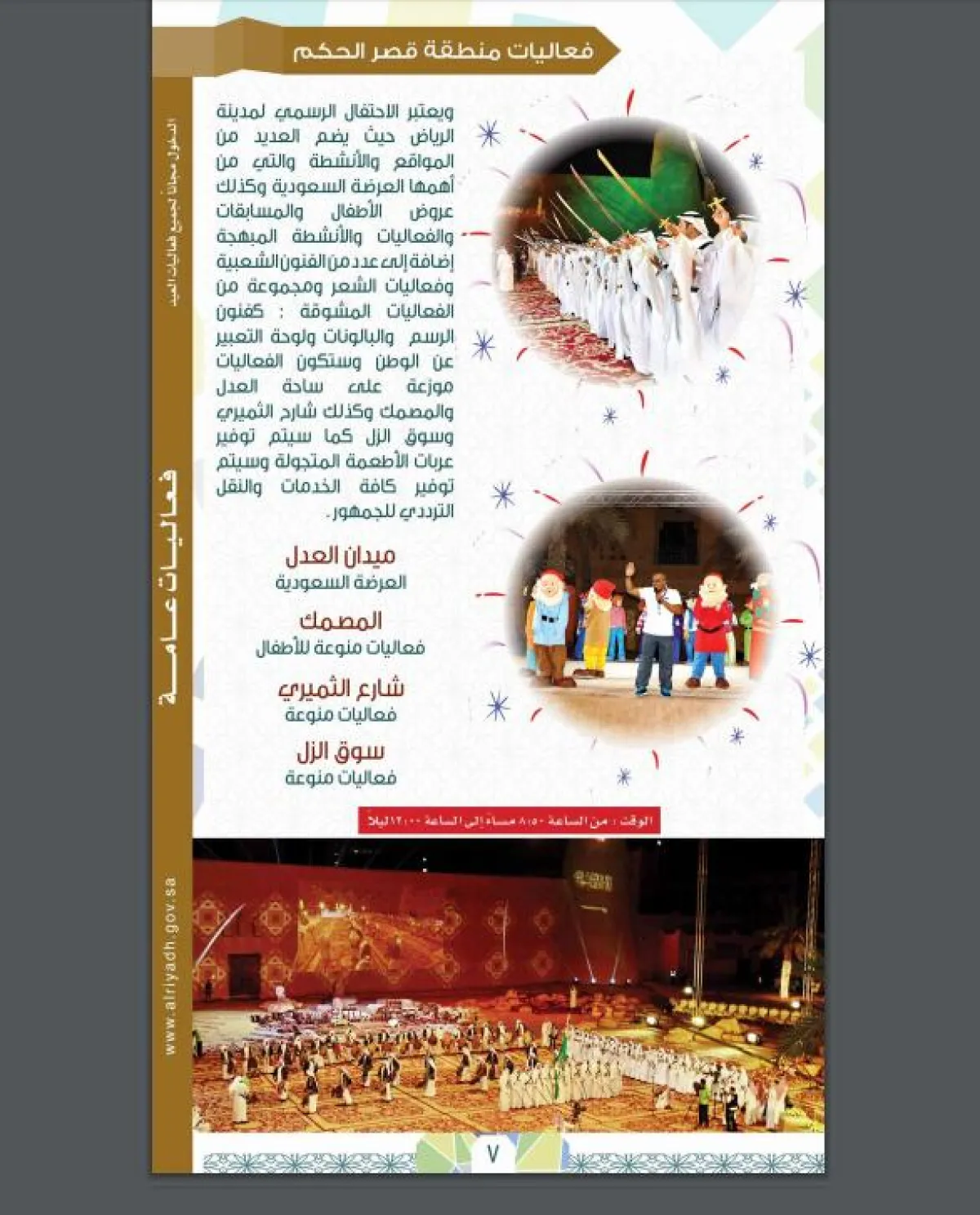 مكان الفعاليات: العرضة في ميدان العدل، فعاليات الأطفال في المصمك، وفعاليات منوعة في شارع الثميري وسوق الزل.