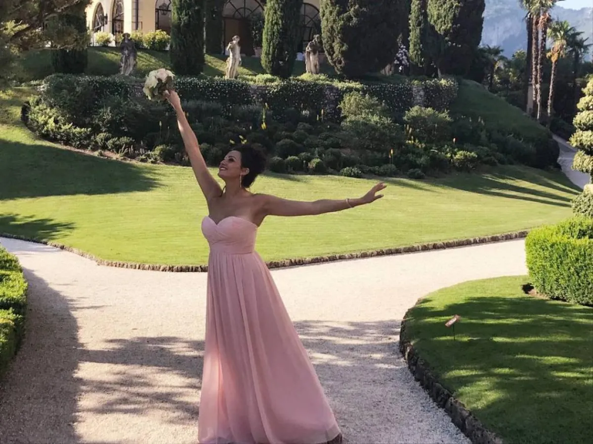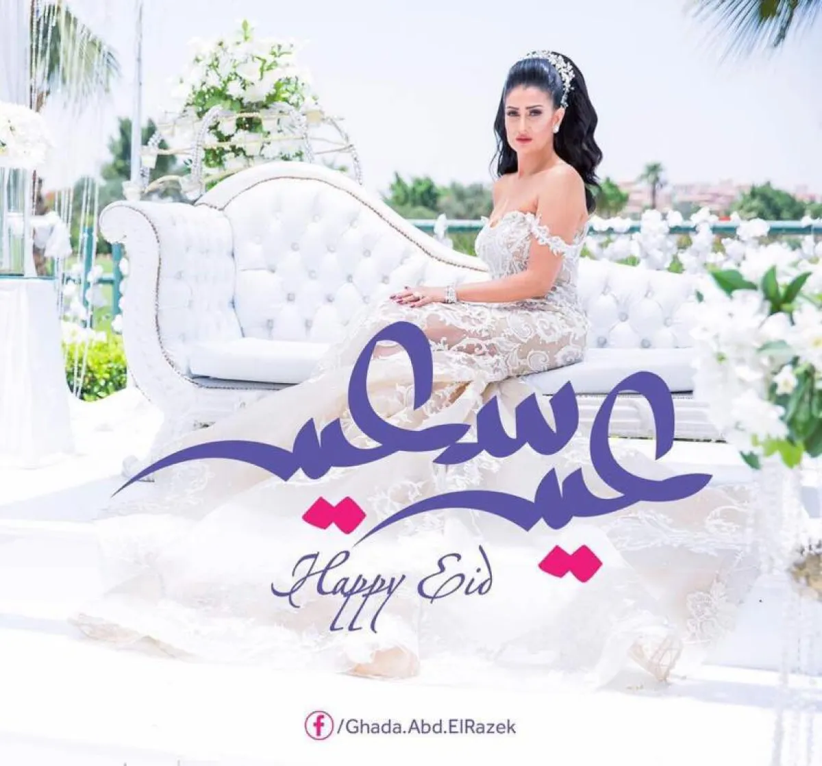 بشرى ظهرت بفستان أقرب لفساتين الزفاف مع باقة ورد وقالت:" العيد فرحة ...كل سنة وكلكم طيبين".