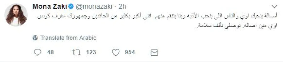 قدمت الفنانة منى زكي دعمها المطلق لصديقتها أصالة وغردت عبر حسابها على تويتر قائلة : أصالة بنحبك أوي والناس اللي بتحب الأذيه ربنا ينتقم منهم، أنتي أكبر بكثير من الحاقدين وجمهورك عارف كويس اوي مين أصالة، توصلي بألف سلامة.