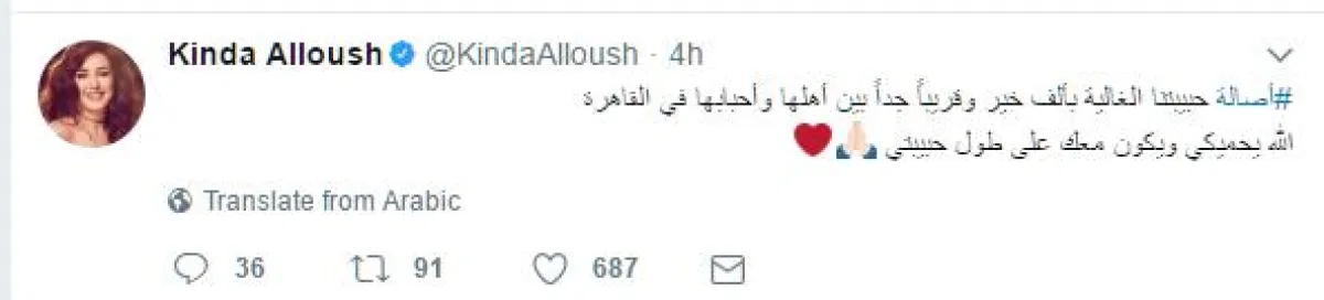 كندة علوش ظلت تترقب موعد وصول مواطنتها أصالة للقاهرة، وتدخلت لطمأنة الجمهور مغردة عبر حسابها على تويتر قائلة: أصالة حبيبتنا الغالية بألف خير وقريبًا جدًا بين أهلها وأحبابها في القاهرة الله يحميكي ويكون معك على طول حبيبتي.