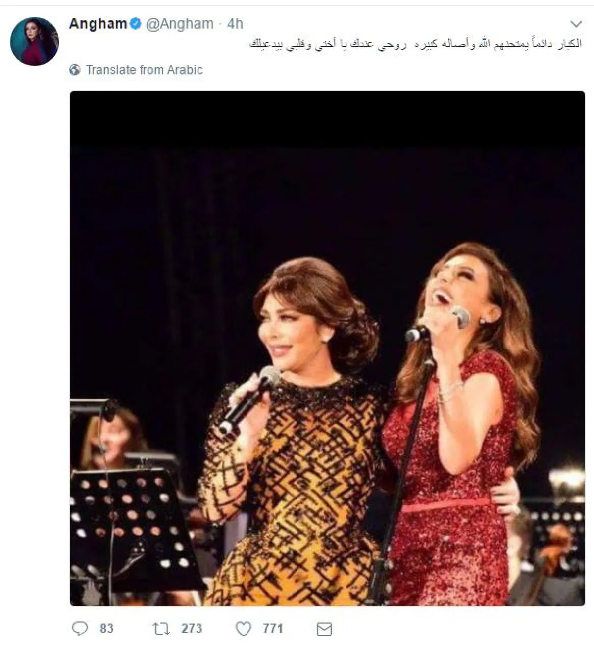 ونشرت الفنانة أنغام صورة تجمعها بأصالة من حفل سابق وعلقت عليها بقولها : الكبار دائما يمتحنهم الله وأصالة كبيرة روحي عندك يا أختي وقلبي بيدعيلك.