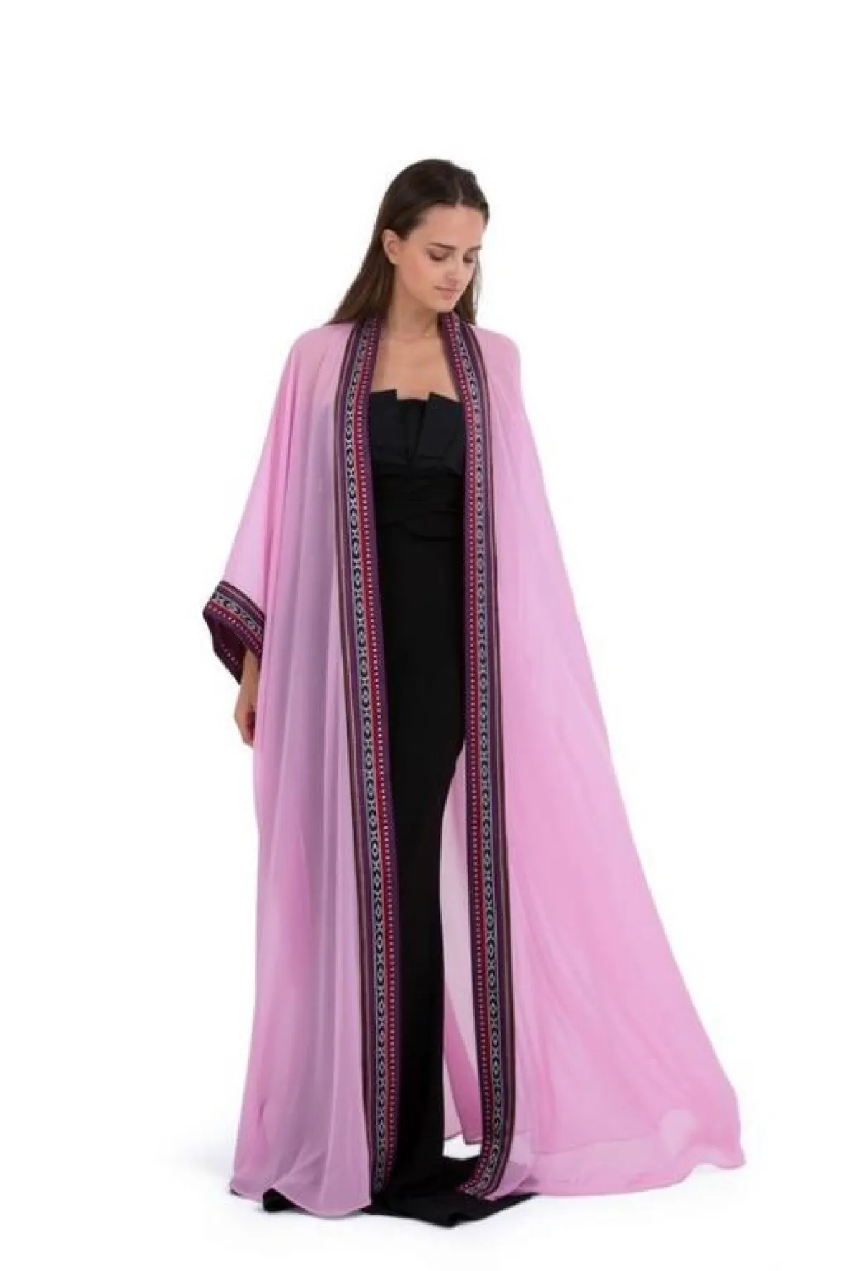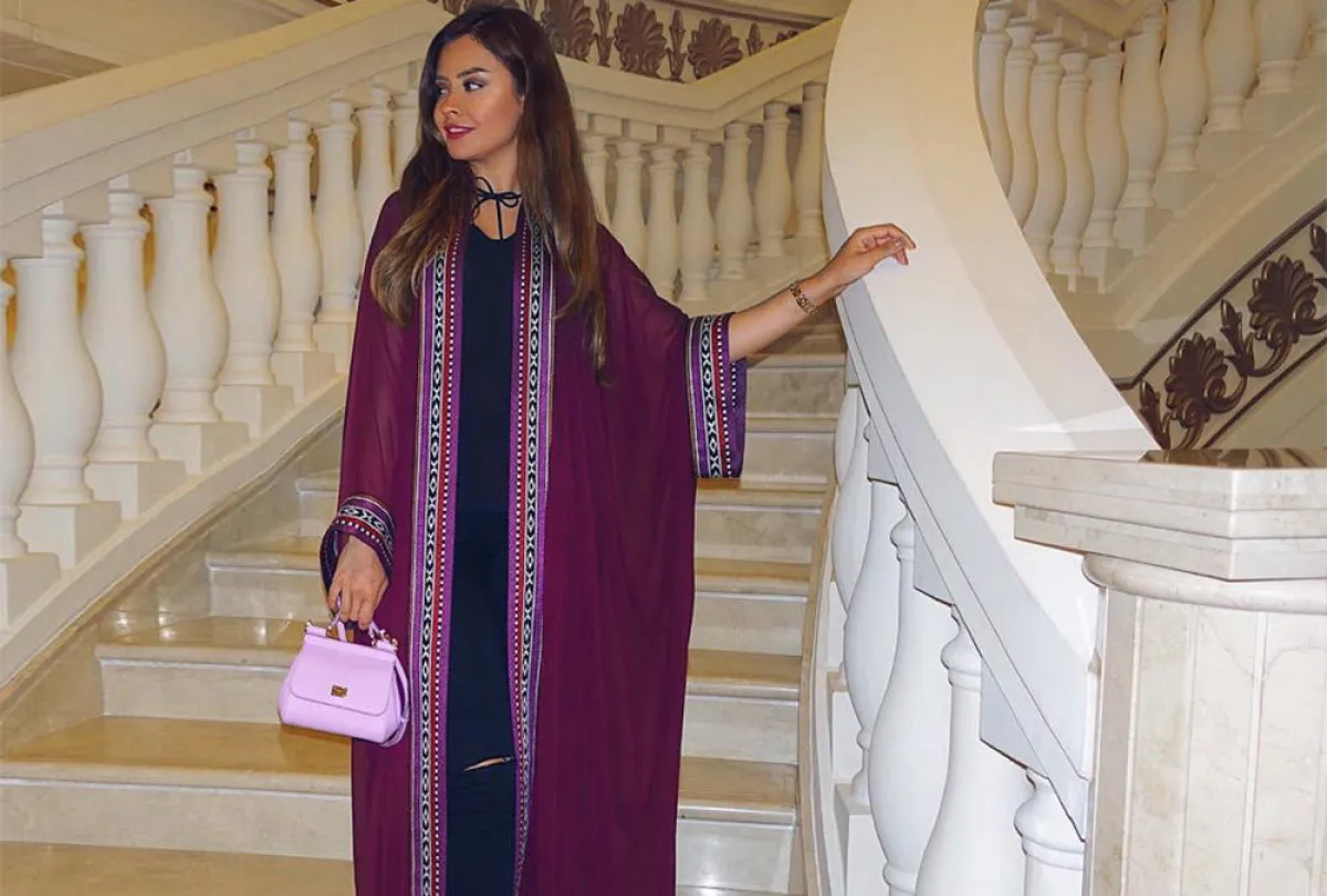 تميّزي ـ سيدتي ـ واحصلي على إطلالة بنفسجية لافتة على طريقة مدوّنة الموضة شهد الجُميلي مع تونيك كاتيا كوفتونوفيتش Katya Kovtunovich المثالي للمناسبات اليومية ، بتصميم العباية المفتوحة، والمصنوعة من قماش الشيفون، باللون البنفسجي الفاتح ومزيّنة بنسيج السدو البدوي التراثي.