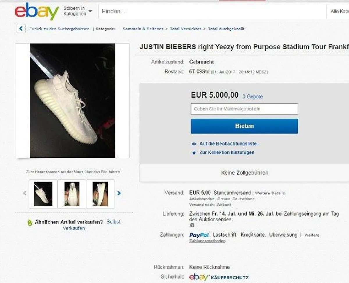 وقد التقط الجمهور حذاء جاستين، حيث إنّ كل فردة من الحذاء ذهبت لشخص مختلف، وقام أحدهم بعرض الحذاء في اليوم التالي على موقع Ebay الشهير، للبيع بـ5 الاف يورو.