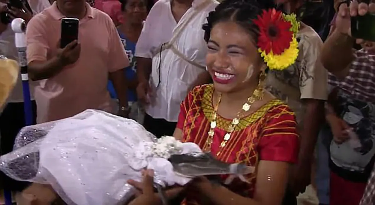 وظهرت "التمساحة" العروس، وهي ترتدي فستاناً أبيض اللون، وعلى رأسها تاج من الورد الأبيض، وتحملها إحدى الموجودات في الحفل لإتمام مراسم الزواج، كما حملها العريس لبعض الوقت وأخذ يرقص معها.