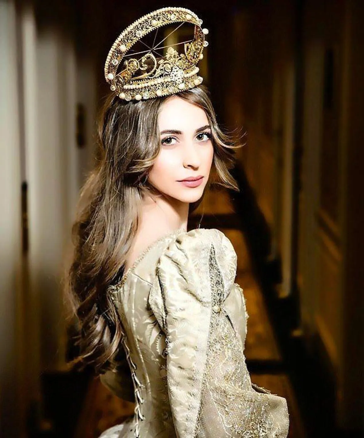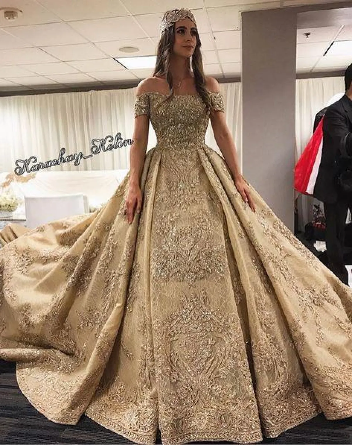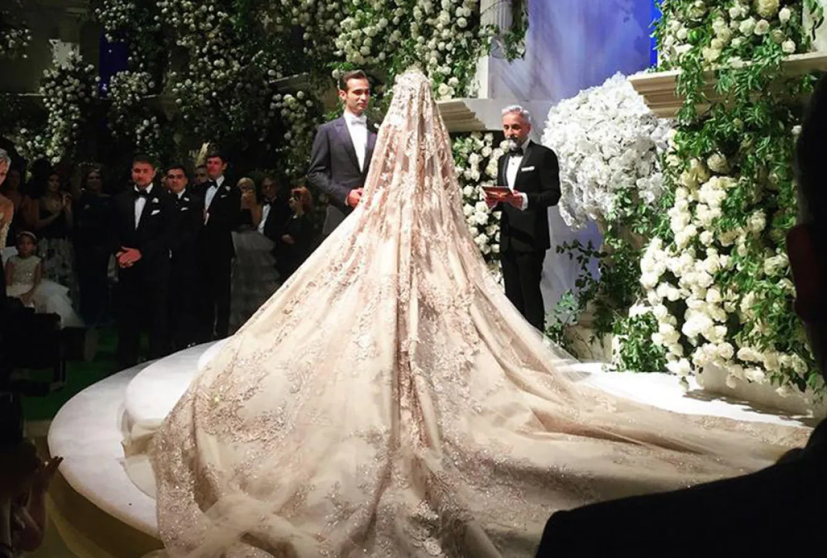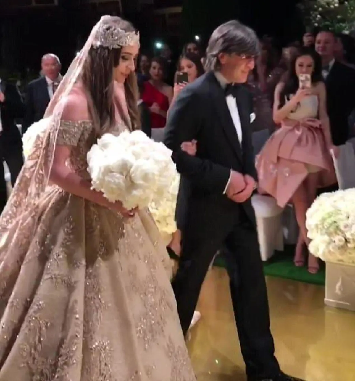 أما فستان زفاف العروس البالغة من العمر 22 عامًا، فقد حمل توقيع المصمم اللبناني العالمي زهير مراد، وتميز بتصميم الأكمام المنسدلة ولونه الذهبي.