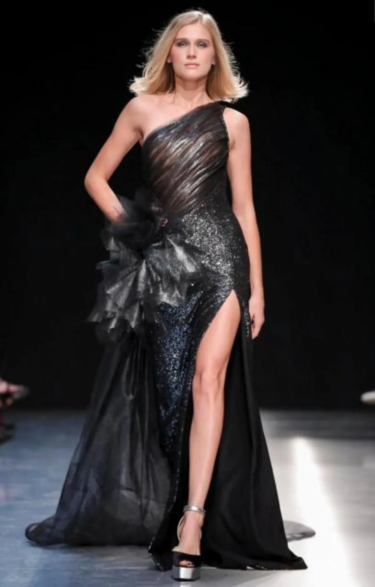 وبعده انتقلنا الى متابعة عرض أزياء دار "جورج شقرا" Georges Chakra التي قدمت مجموعة غنية، بدا فيها الكثير من التناقضات الابداعية، حيث امتزجت الأقمشة القاسية مع الأقمشة المرهفة، وامتزج الاحساس الرومانسية مع الاحساس الدراماتيكي القوي، وشاهدنا في نهاية العرض مجموعة رائعة من الفساتين التي صنعت من أقمشة التول المرهف والتي ذكرتنا بالعصر الذهبي في حقبة الخمسينات.