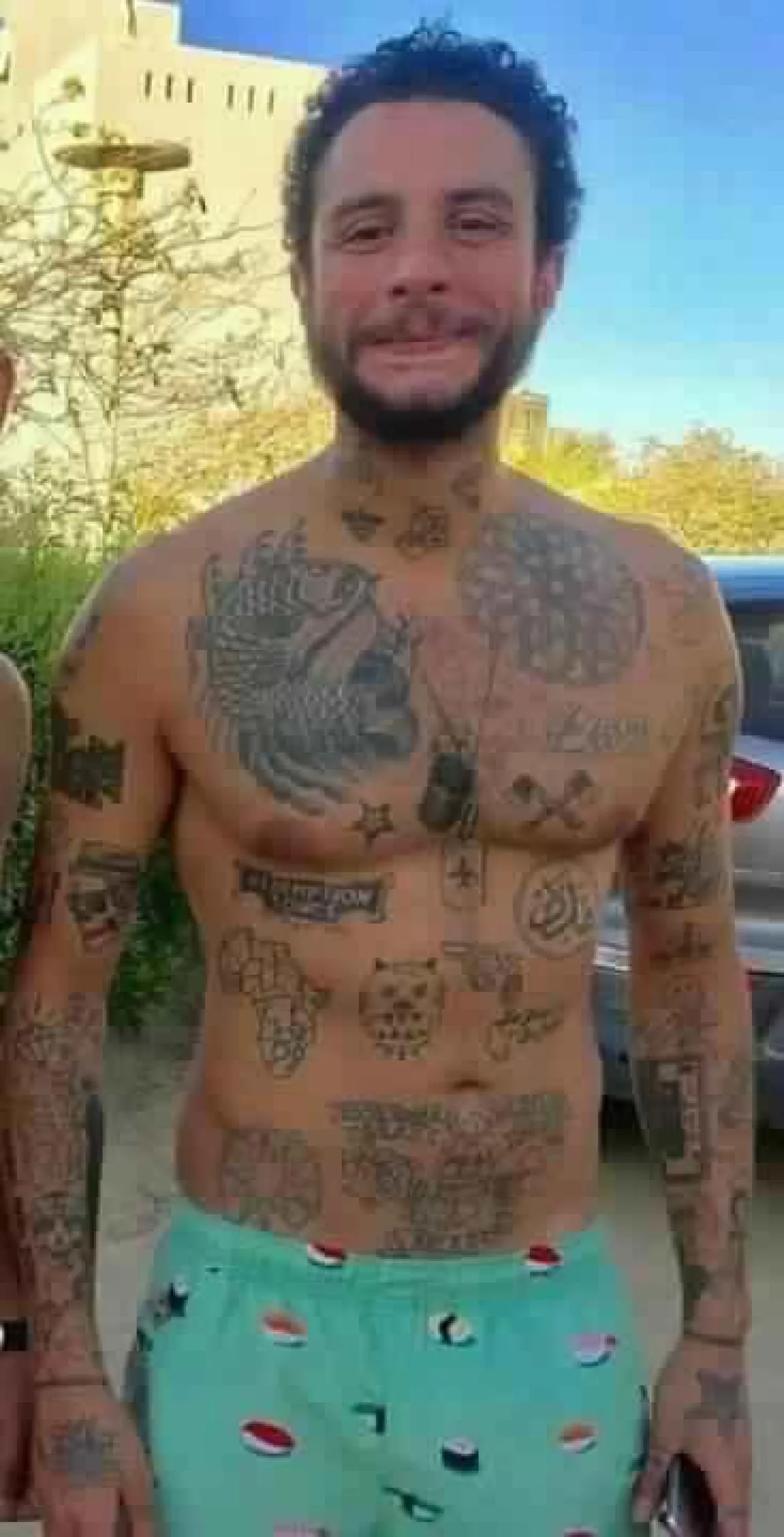 وقد بدا الفيشاوي في الصورة بملابس البحر وكان التاتو واضحاً على جسده للمرة الأولى.