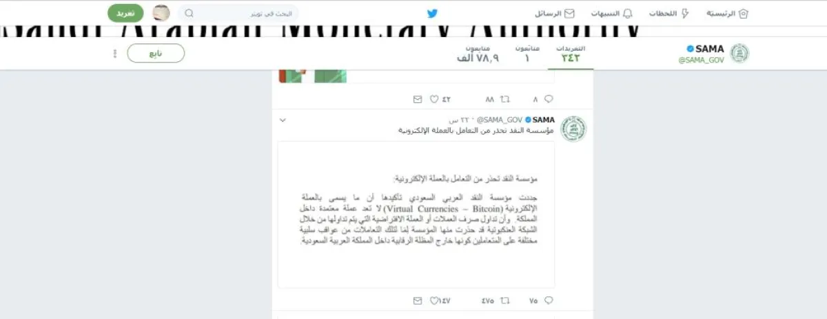 وأوضحت المؤسسة عبر حسابها في موقع تويتر، أن تداول صرف العملات، أو العملة الافتراضية، التي يتم تداولها من خلال الشبكة العنكبوتية له عواقب سلبية مختلفة على المتعاملين كونها خارج المظلة الرقابية داخل السعودية.