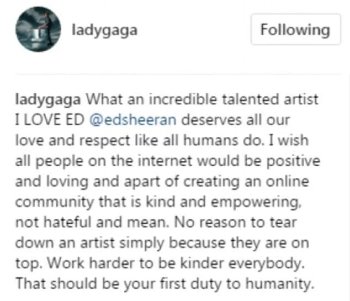 وفي المقابل تضامنت غاغا مع زميلها بنشر صورة لها معه على انستقرام، أرفقتها بتعليق كتبت فيه: "يستحق منا كل الحب والاحترام"، إلّا أنّ النجمة أخطأت بحساب إيد شيران، وشاركت الصورة مع حساب مزيف.