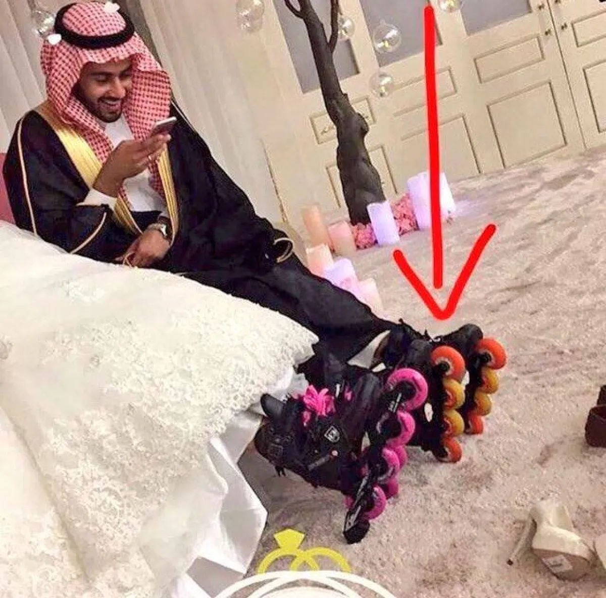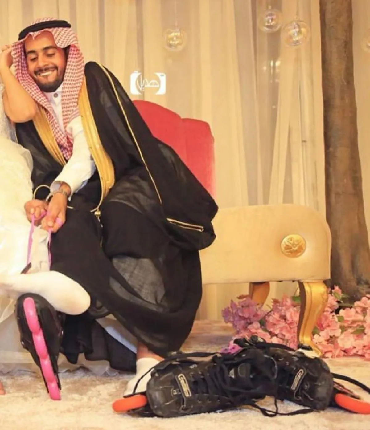 في بادرة طريفة ولا تخلو من الغرابة، أقنع الشاب السعودي حسين بن محفوظ عروسه حنان الريمي بارتداء الزلاجات "السكيت" في مراسم الزفة ليلة عرسهما.