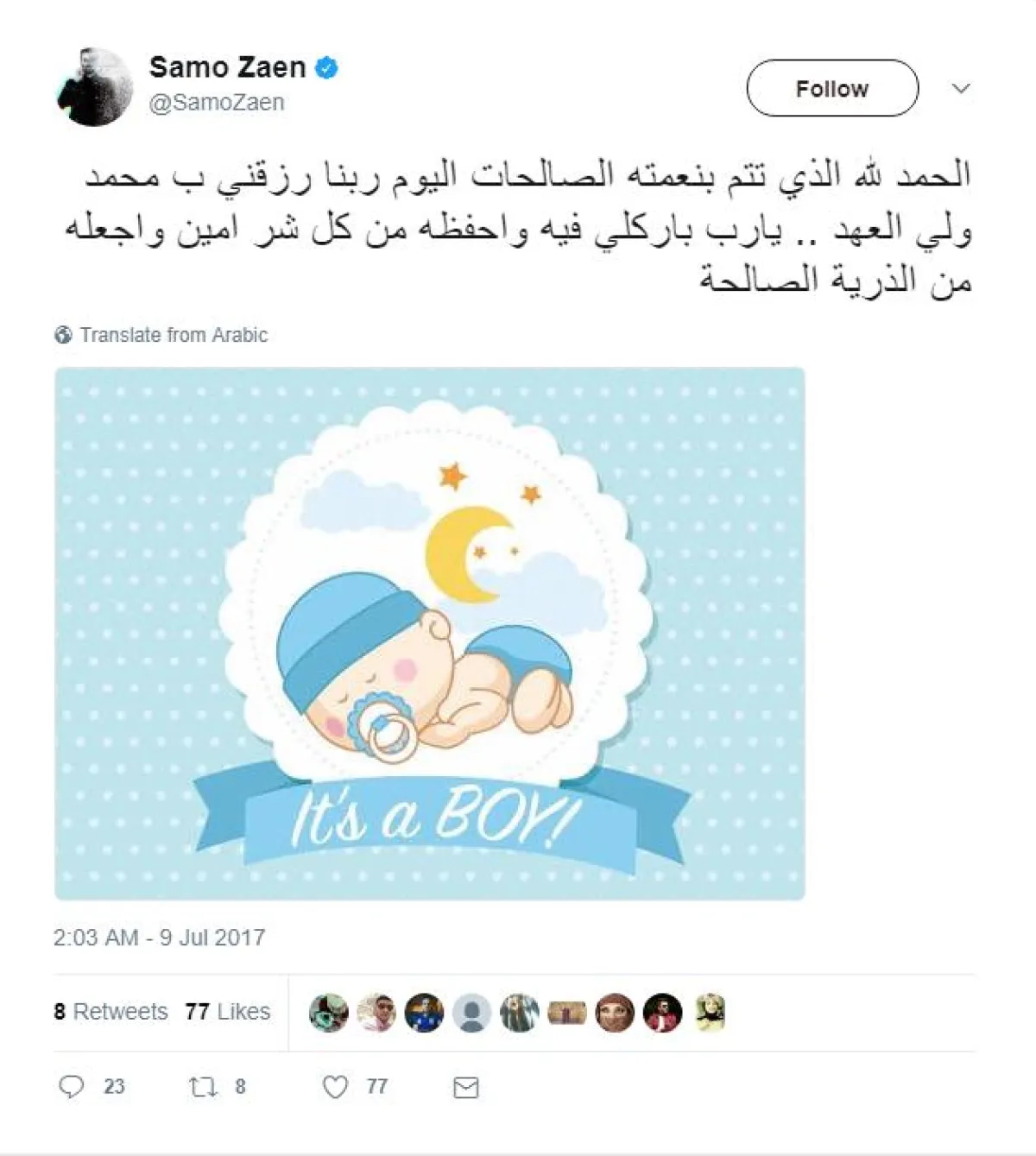 سامو زين أعلن الخبر عبر تغريدةٍ على حسابه الخاص بموقع تويتر قال فيها: الحمد لله الذي تتم بنعمته الصالحات.. اليوم ربّنا رزقني بـ(محمد) ولي العهد.. يا رب بارك لي فيه واحفظه من كل شر آمين واجعله من الذرية الصالحة، ونشر معها صورةً لرضيعٍ مكتوب أسفلها أنّه صبي!!