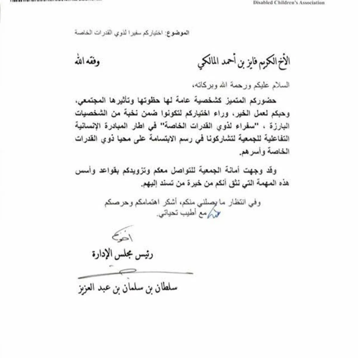 الفنان فايز المالكي نشر عبر حسابه على "انستقرام" كتاب تعيينه سفيراً للجمعية وعلق عليه: "شكرا سمو سيدي الأمير سلطان بن سلمان على اختياري سفيراً لذوي الاحتياجات الخاصة".