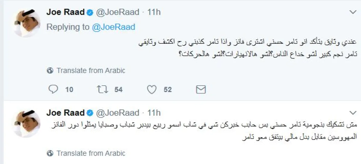 وكان جو قد كتب سلسلة تغريدات، اتّهم فيها تامر حسني بشراء "فانز" ليمثّلوا دور المهووسين به، الذين ينهارون لرؤيته، وقال إنّه يعرف شاباً يدعى ربيع، يقوم بتأمين "الفانز" المزعومين للفنانين مقابل بدلٍ مالي.