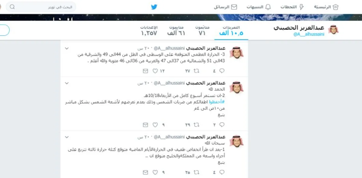 وقال الحصيني في حسابه الشخصي على موقع التواصل الاجتماعي "تويتر": "بعد أن طرأ انخفاض طفيف على درجات الحرارة في الأيام الماضية، يُتوقَّع أن تشهد أجزاء واسعة من السعودية ودول الخليج كتلة حرارية ثالثة، ومن المتوقع أيضاً أن تستمر أسبوعاً كاملاً".