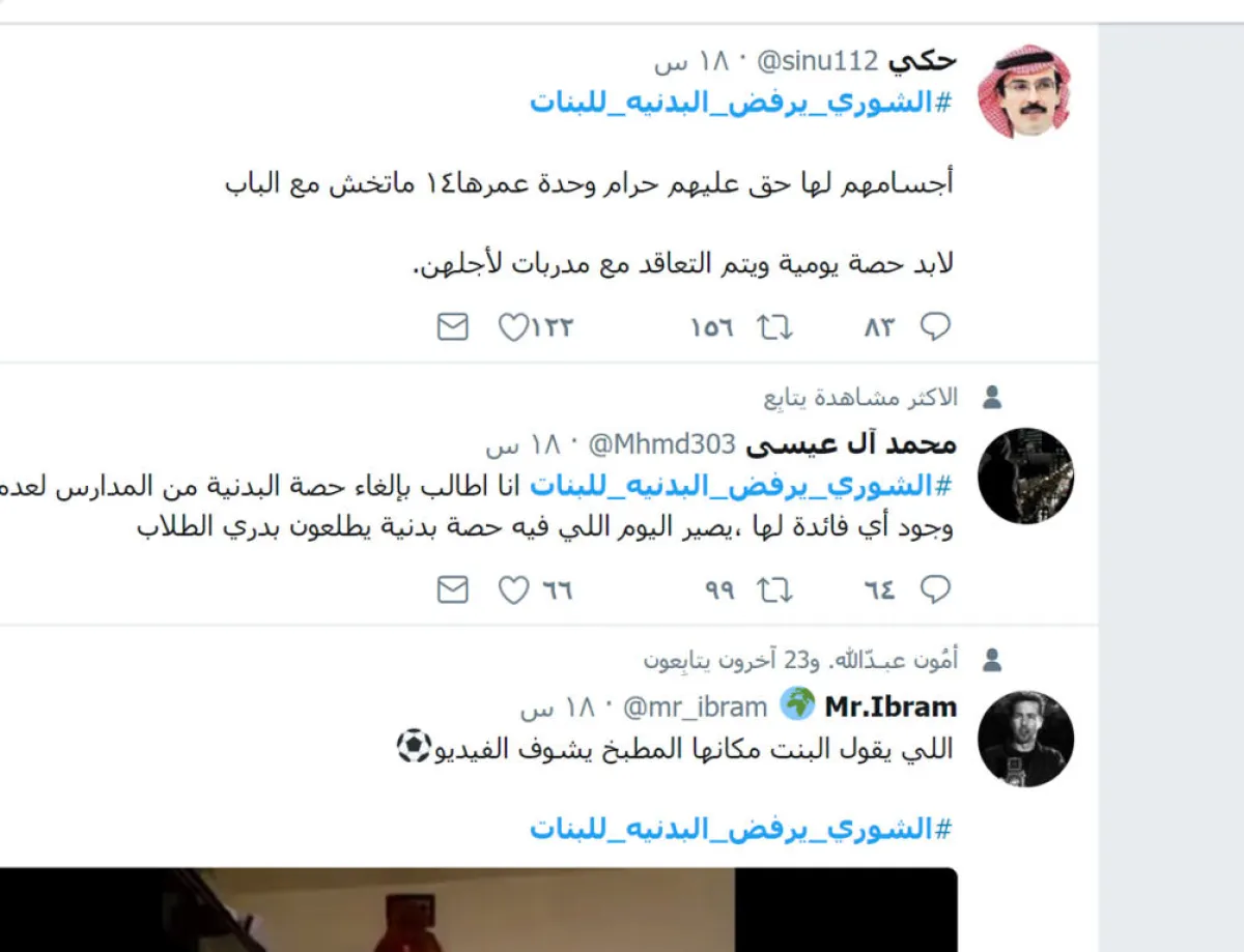 عليه، تصدَّر هاشتاق بعنوان "#الشورى_يرفض_البدنية_للبنات"، قائمة الهاشتاقات الأكثر تداولاً في موقع "تويتر". وفيه تباينت آراء المغردين، لكنها أكدت في أغلبها على حق البنات في إدخال منهج التربية البدنية إلى مناهجهن بالمدارس والجامعات، بينما رأى آخرون أن الأندية الرياضية النسائية ستكون كافية، وستؤدي الغرض المطلوب منها.